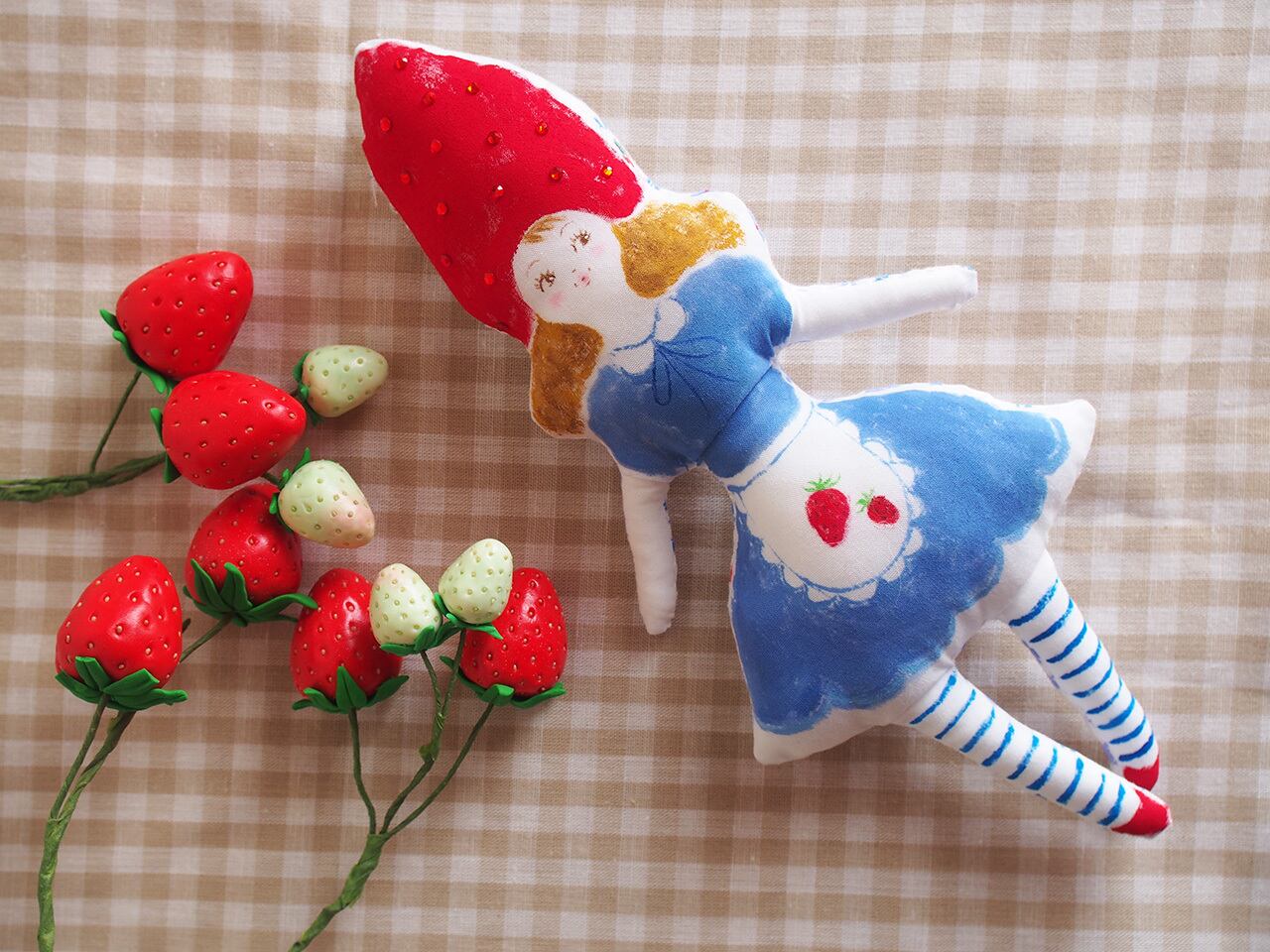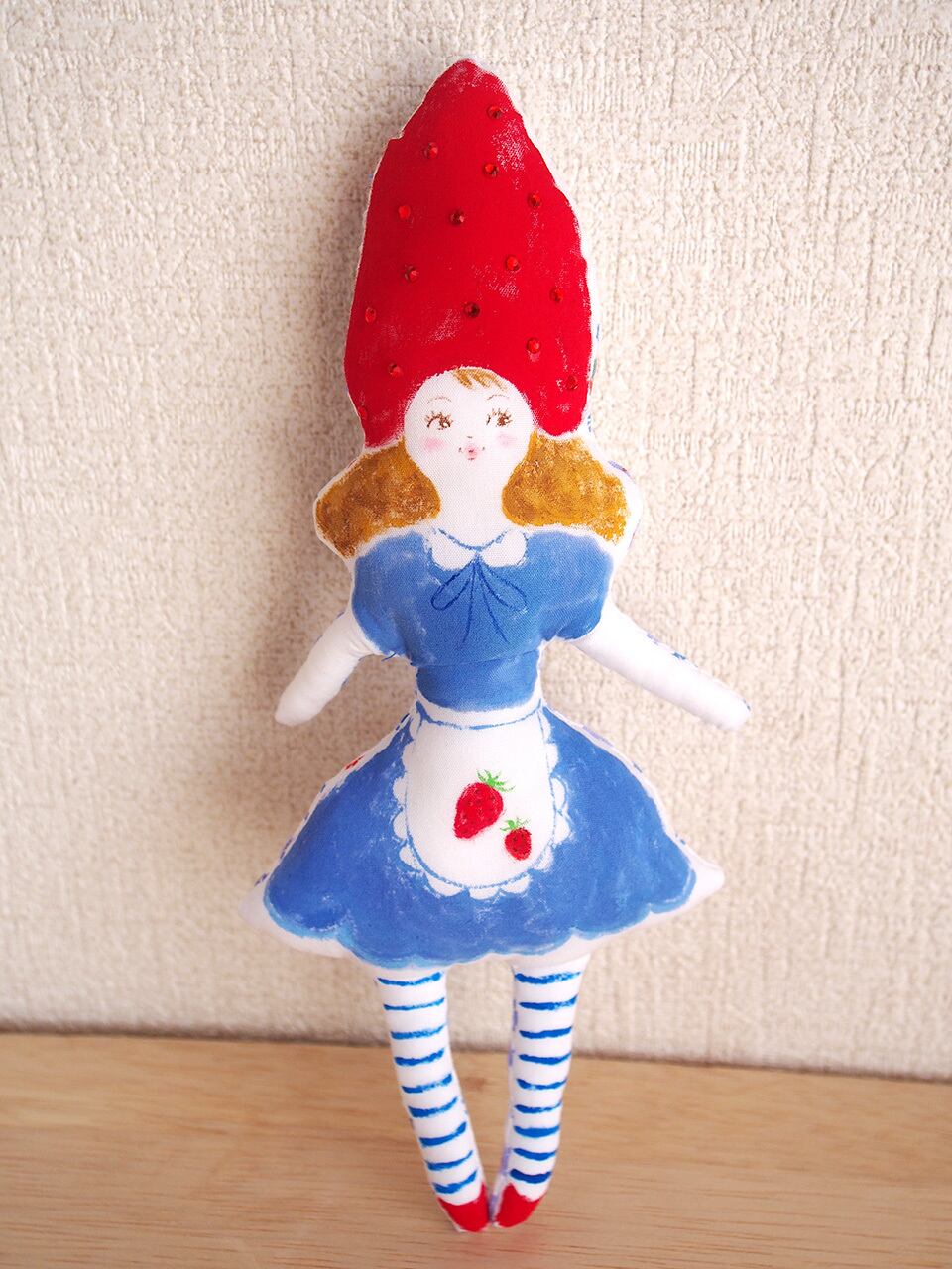 白、またはキナリの布を手縫いし、綿を入れて人形の形を作り、そこへ直接アクリル絵の具で着色しています。