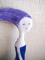 白、またはキナリの布を手縫いし、綿を入れて人形の形を作り、そこへ直接アクリル絵の具で着色しています。