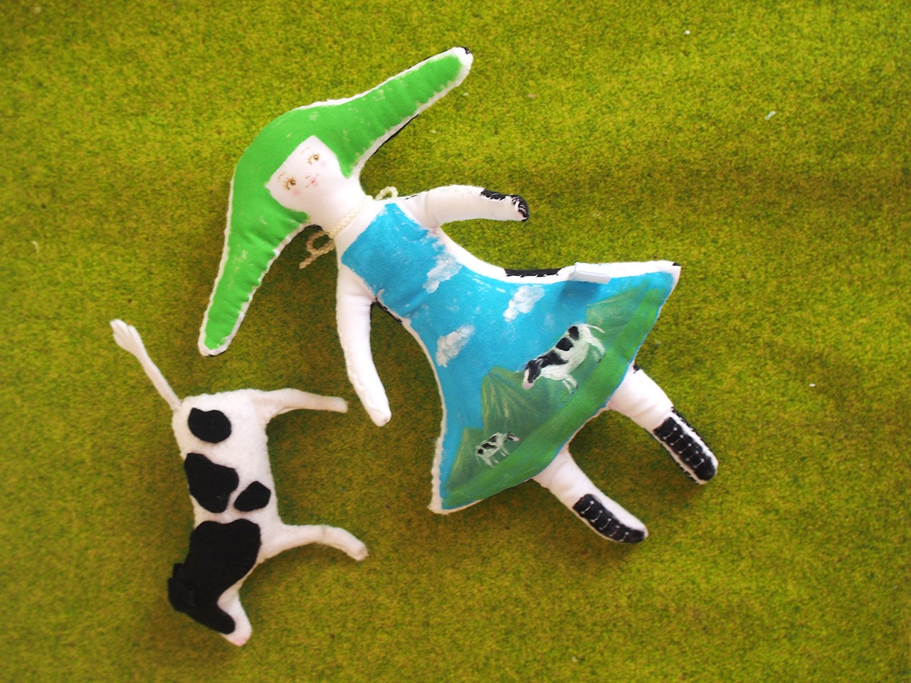 白、またはキナリの布を手縫いし、綿を入れて人形の形を作り、そこへ直接アクリル絵の具で着色しています。