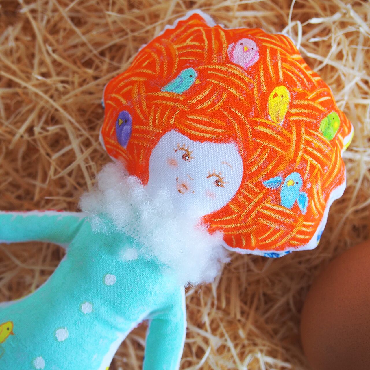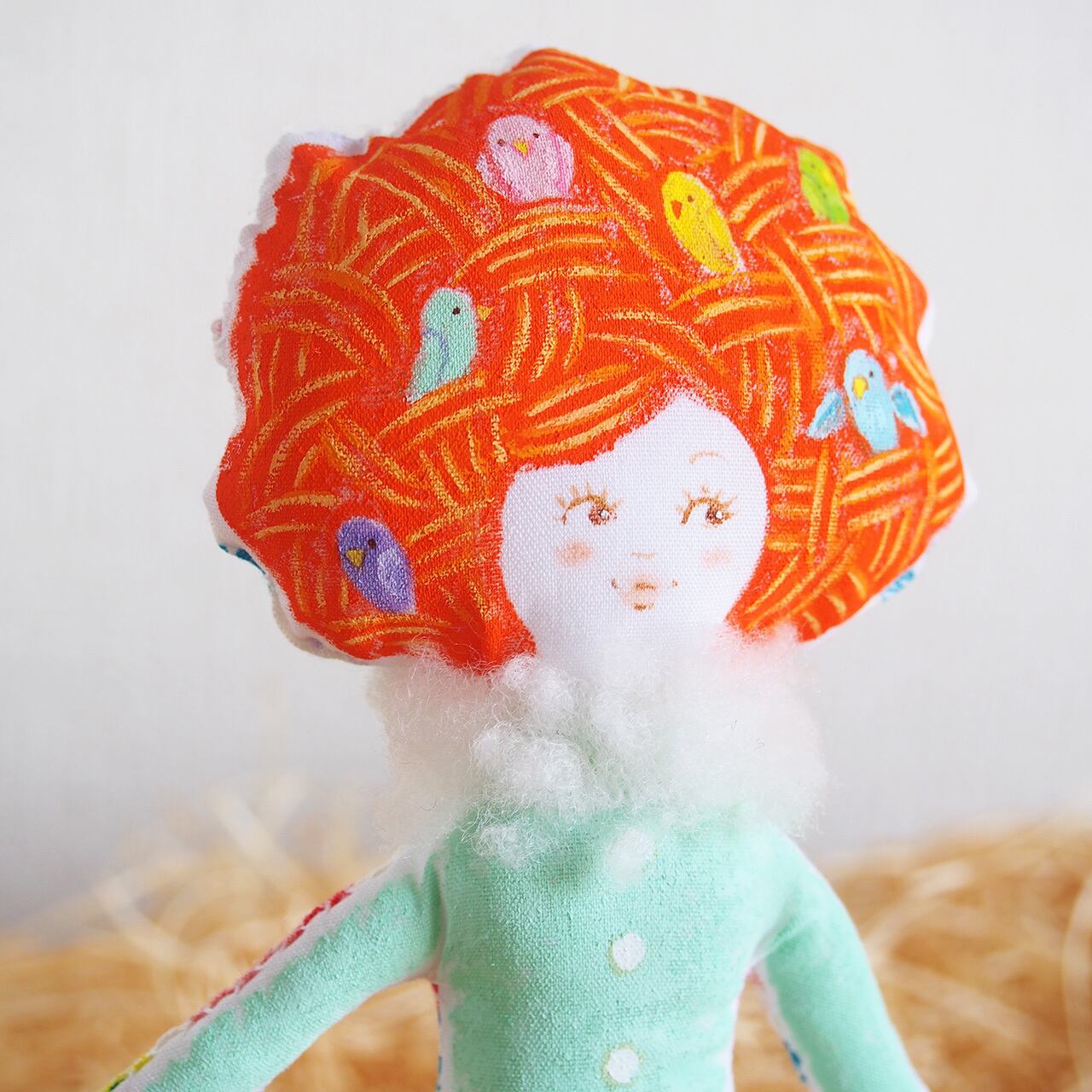 白、またはキナリの布を手縫いし、綿を入れて人形の形を作り、そこへ直接アクリル絵の具で着色しています。