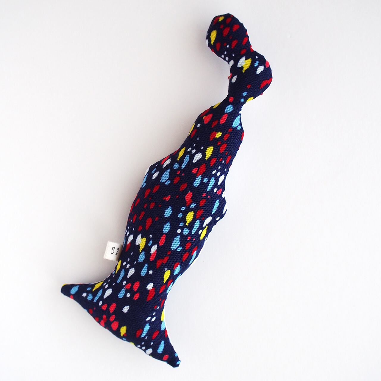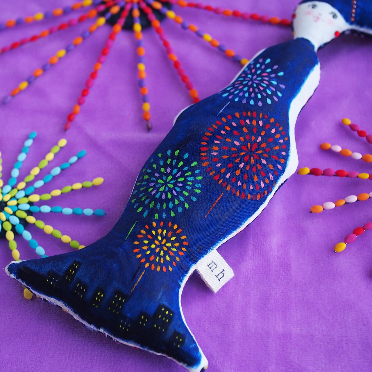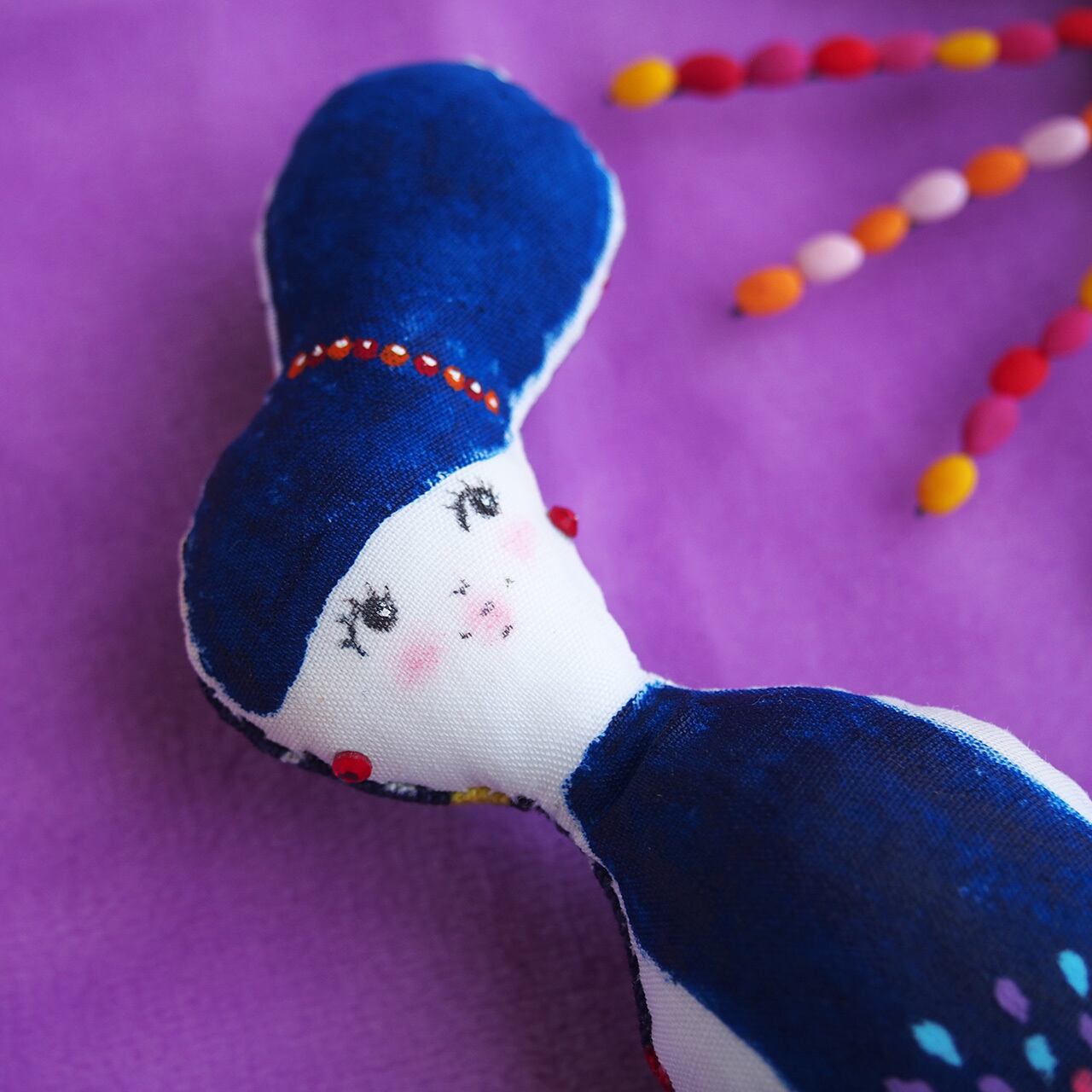 白、またはキナリの布を手縫いし、綿を入れて人形の形を作り、そこへ直接アクリル絵の具で着色しています。