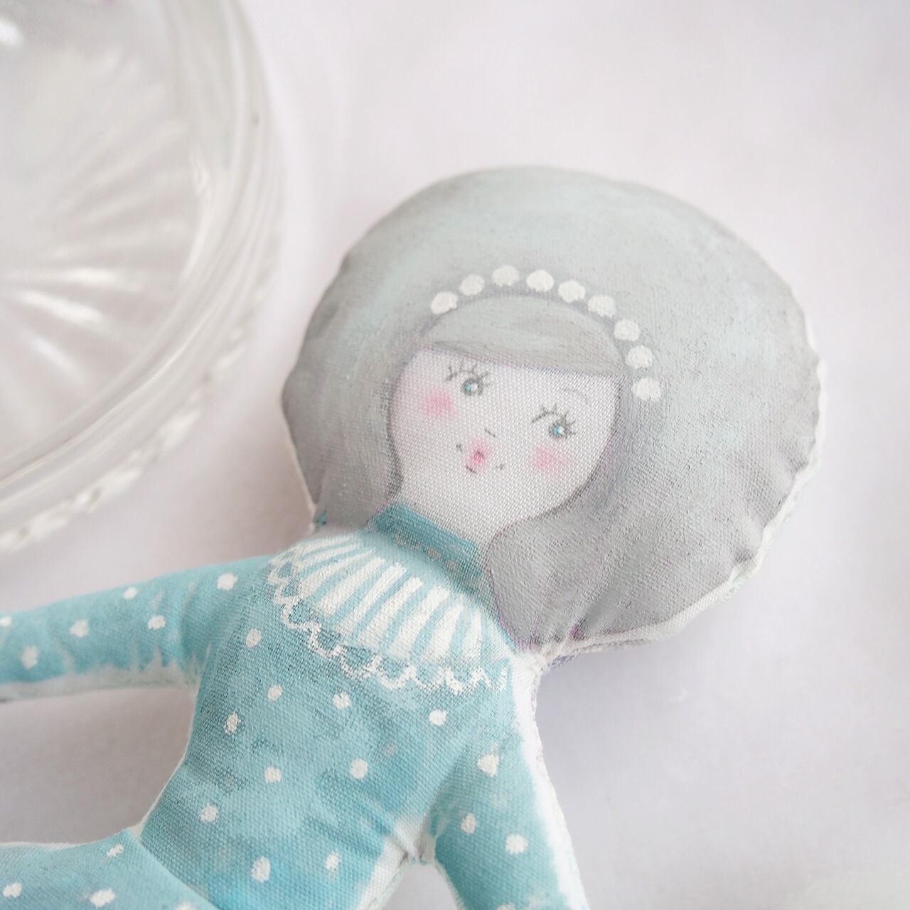 白、またはキナリの布を手縫いし、綿を入れて人形の形を作り、そこへ直接アクリル絵の具で着色しています。