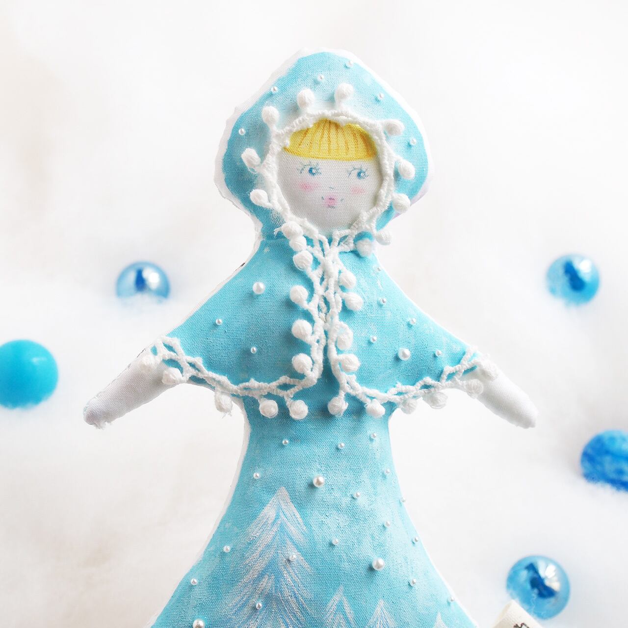雪景色が描かれた水色のコートに、雪をイメージした小さなパールを散りばめ、