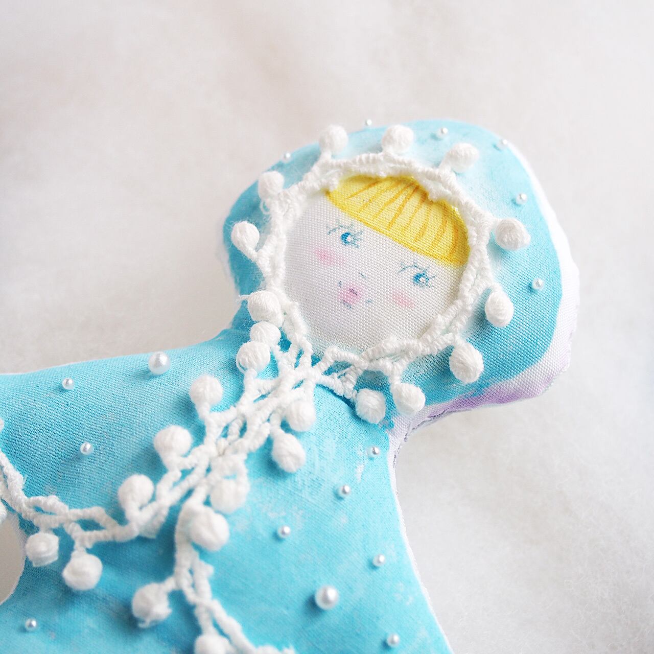白、またはキナリの布を手縫いし、綿を入れて人形の形を作り、そこへ直接アクリル絵の具で着色しています。