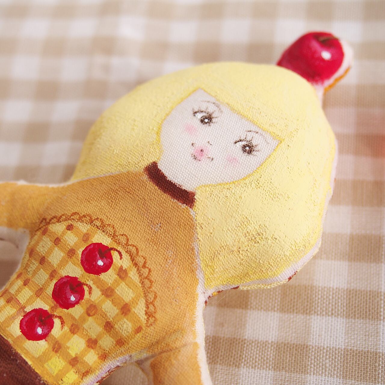 白、またはキナリの布を手縫いし、綿を入れて人形の形を作り、そこへ直接アクリル絵の具で着色しています。