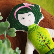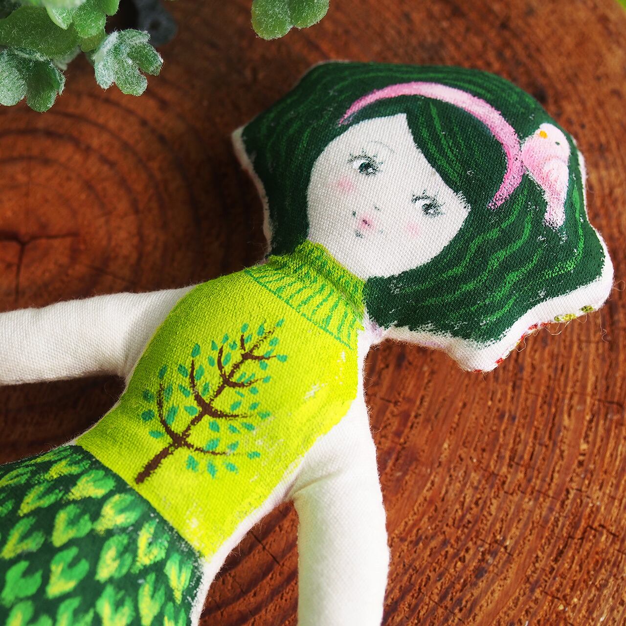 白、またはキナリの布を手縫いし、綿を入れて人形の形を作り、そこへ直接アクリル絵の具で着色しています。