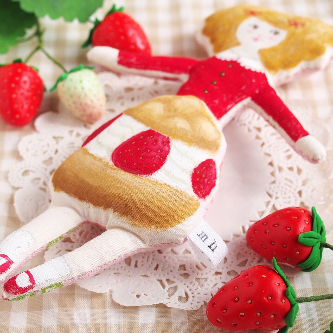 白、またはキナリの布を手縫いし、綿を入れて人形の形を作り、そこへ直接アクリル絵の具で着色しています。