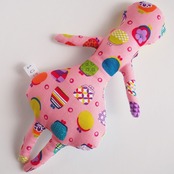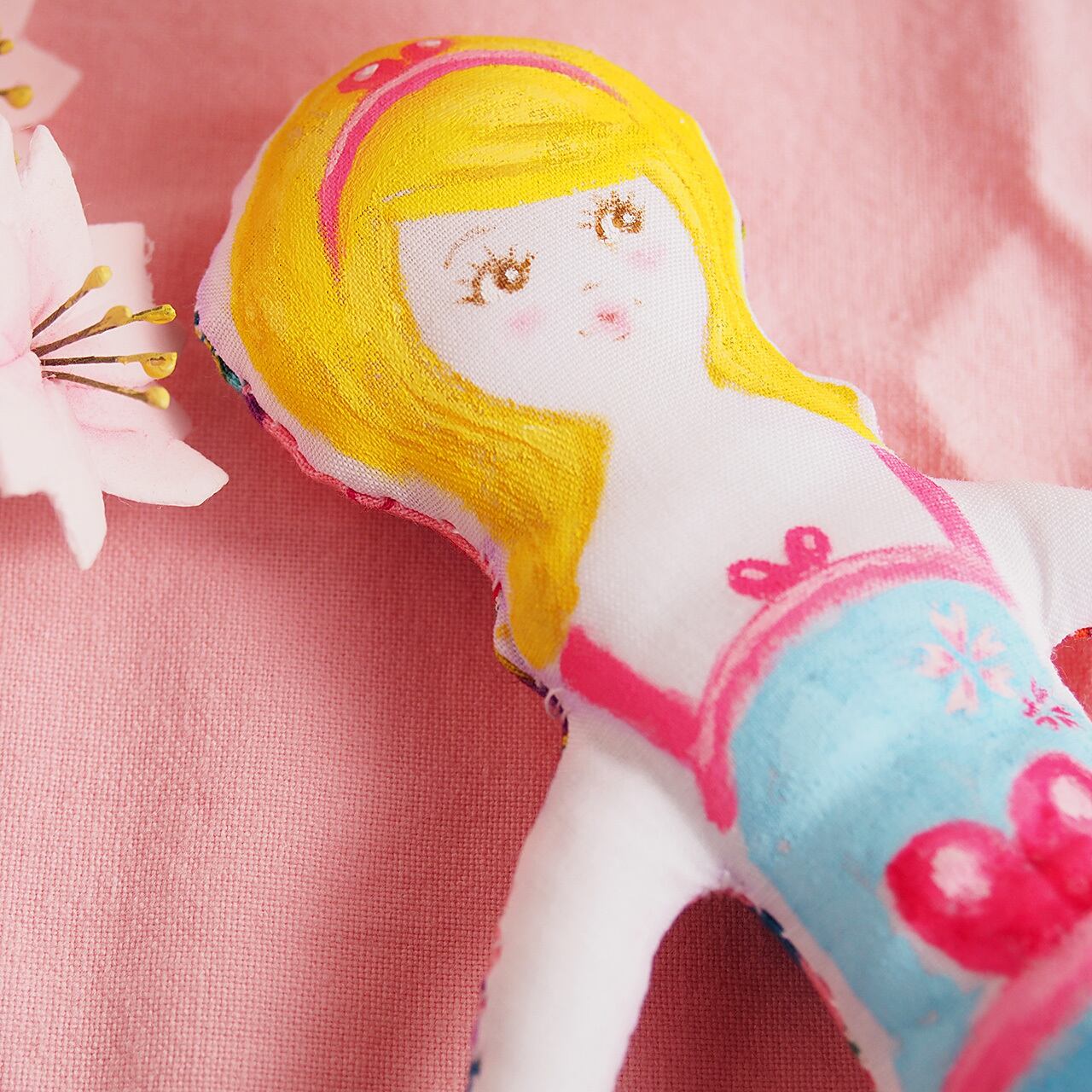 白、またはキナリの布を手縫いし、綿を入れて人形の形を作り、そこへ直接アクリル絵の具で着色しています。