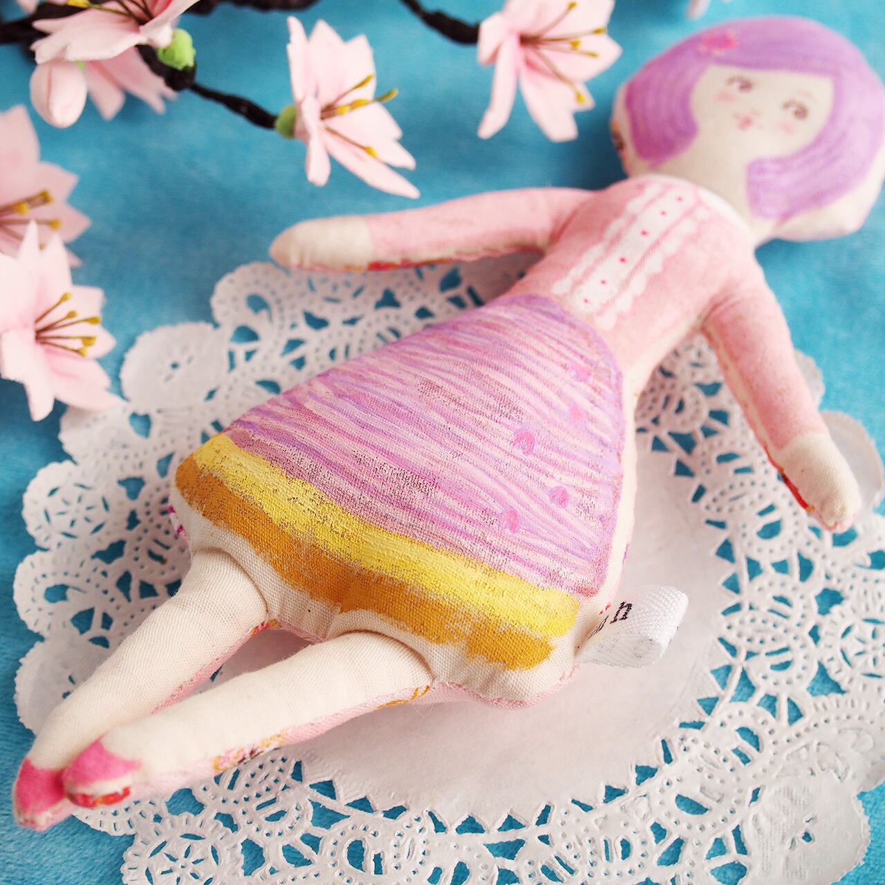 白、またはキナリの布を手縫いし、綿を入れて人形の形を作り、そこへ直接アクリル絵の具で着色しています。