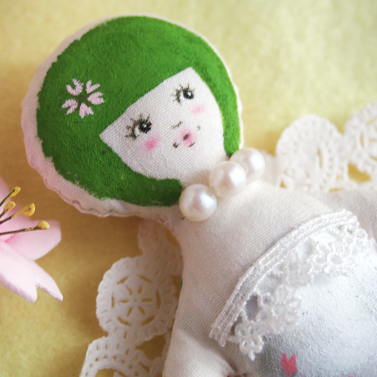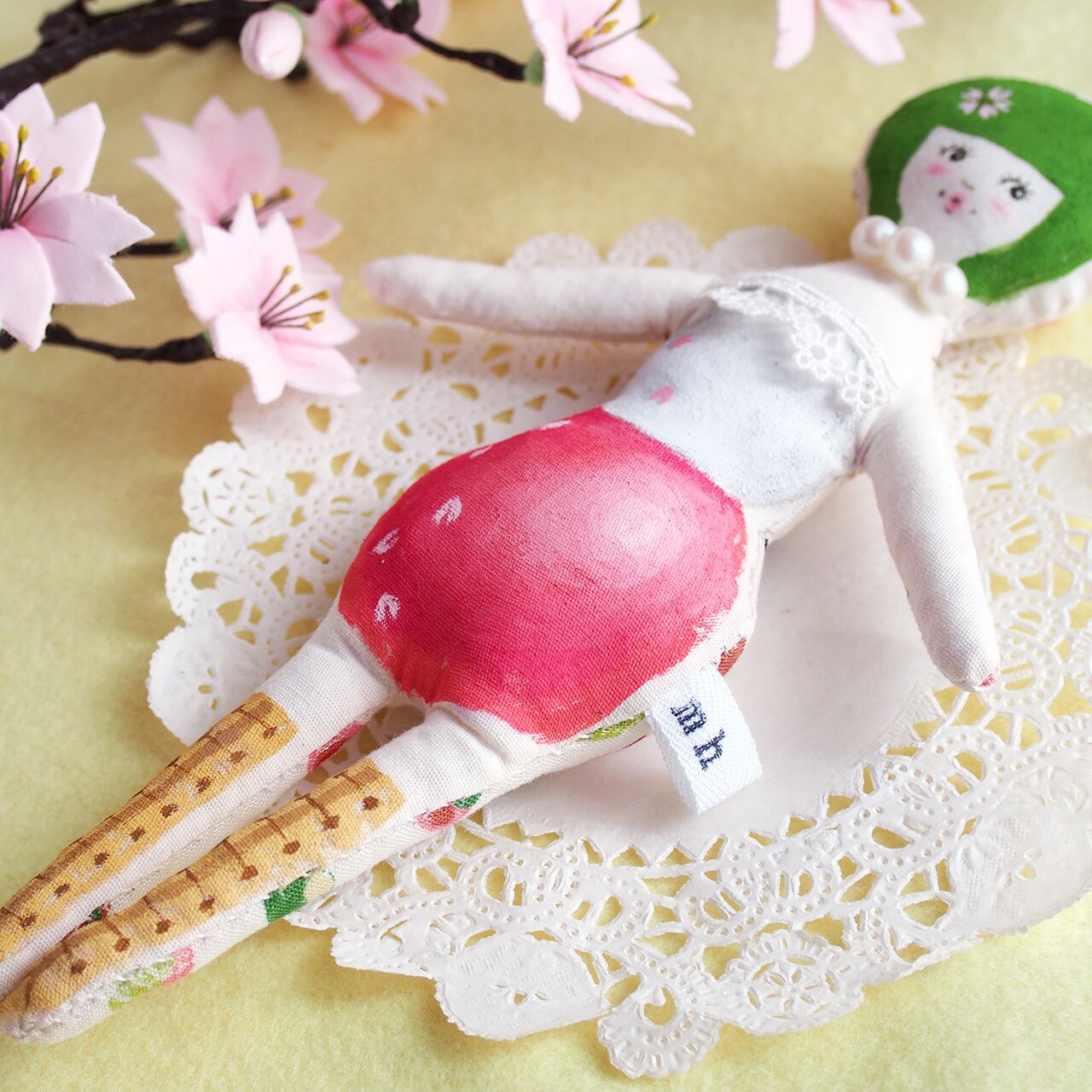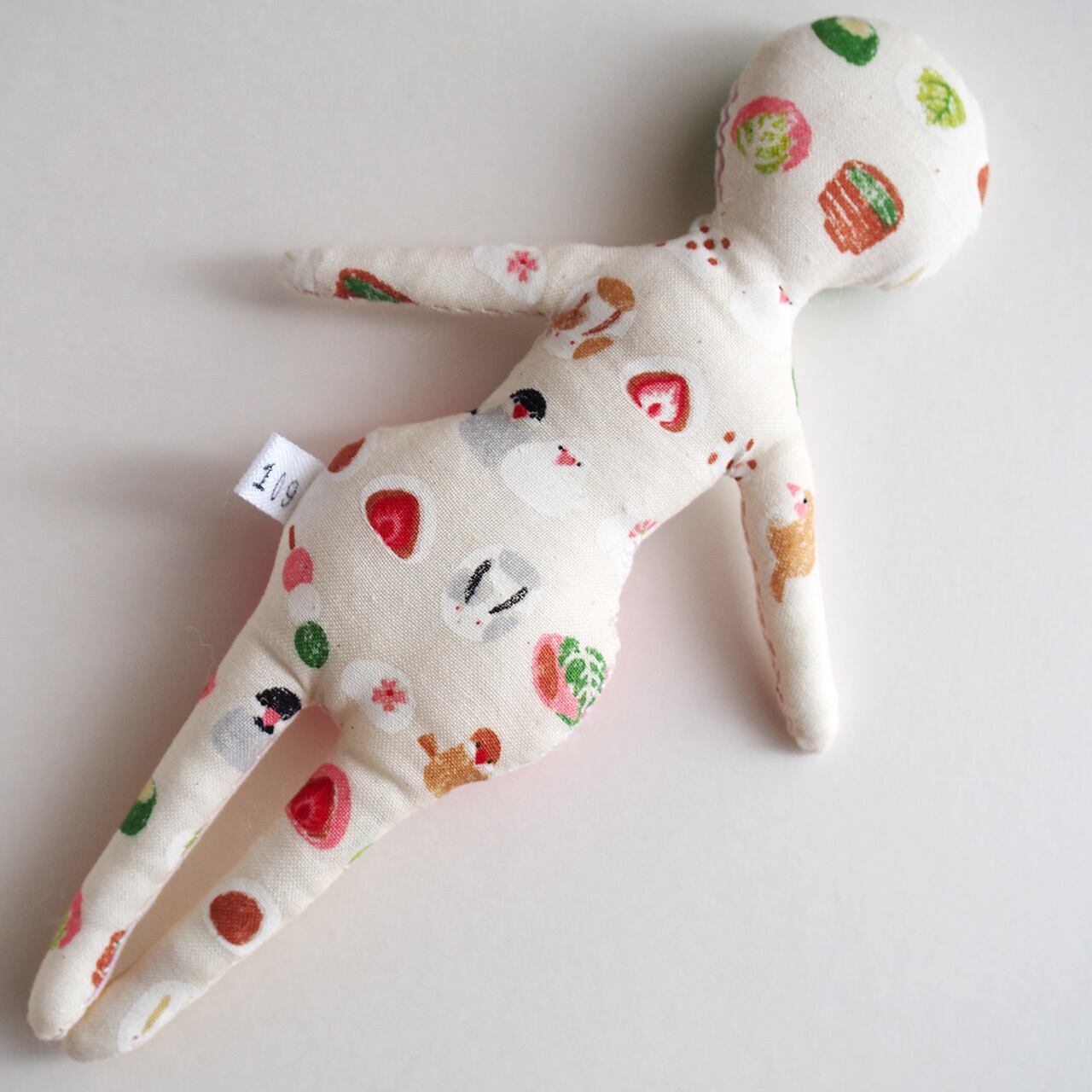 白、またはキナリの布を手縫いし、綿を入れて人形の形を作り、そこへ直接アクリル絵の具で着色しています。