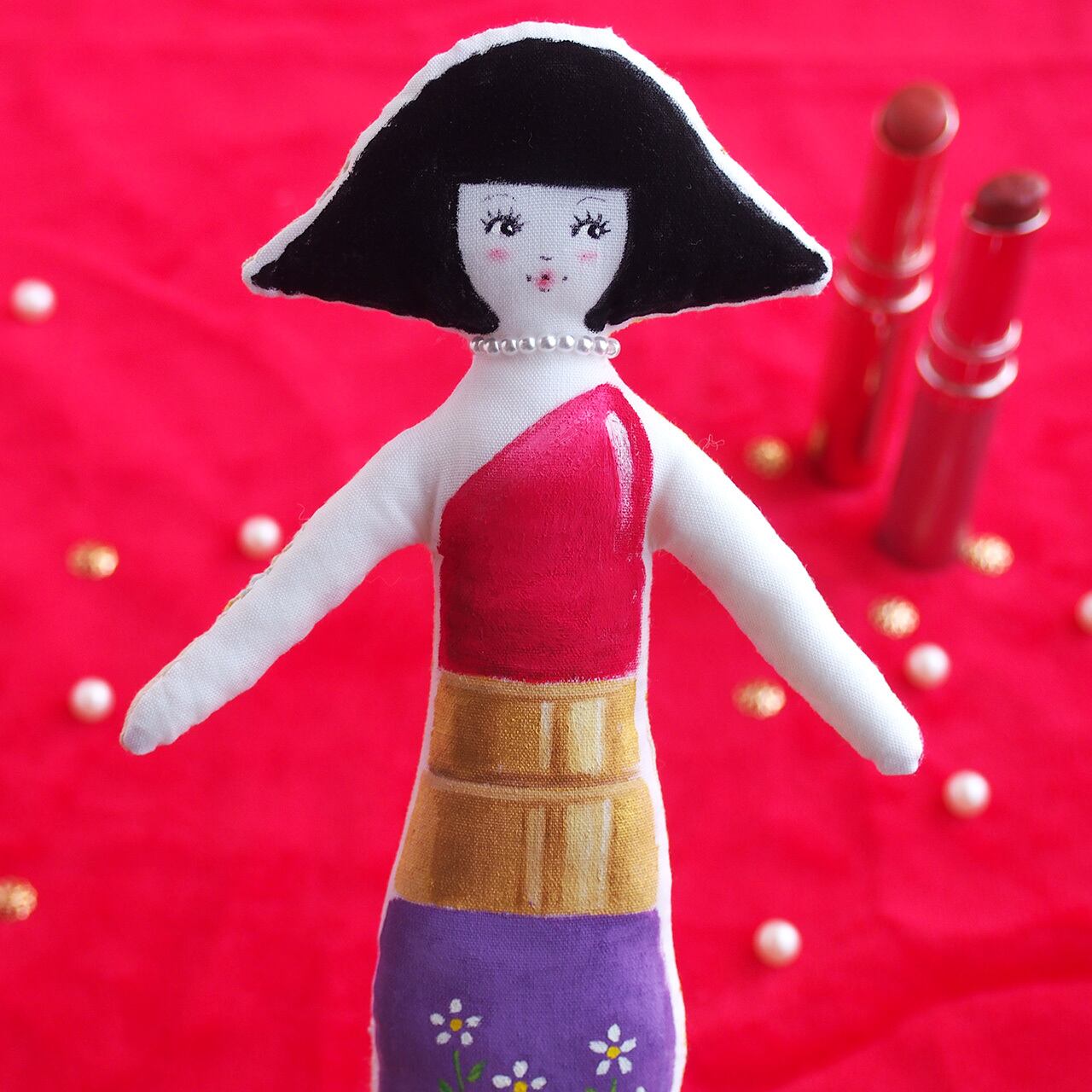 白、またはキナリの布を手縫いし、綿を入れて人形の形を作り、そこへ直接アクリル絵の具で着色しています。