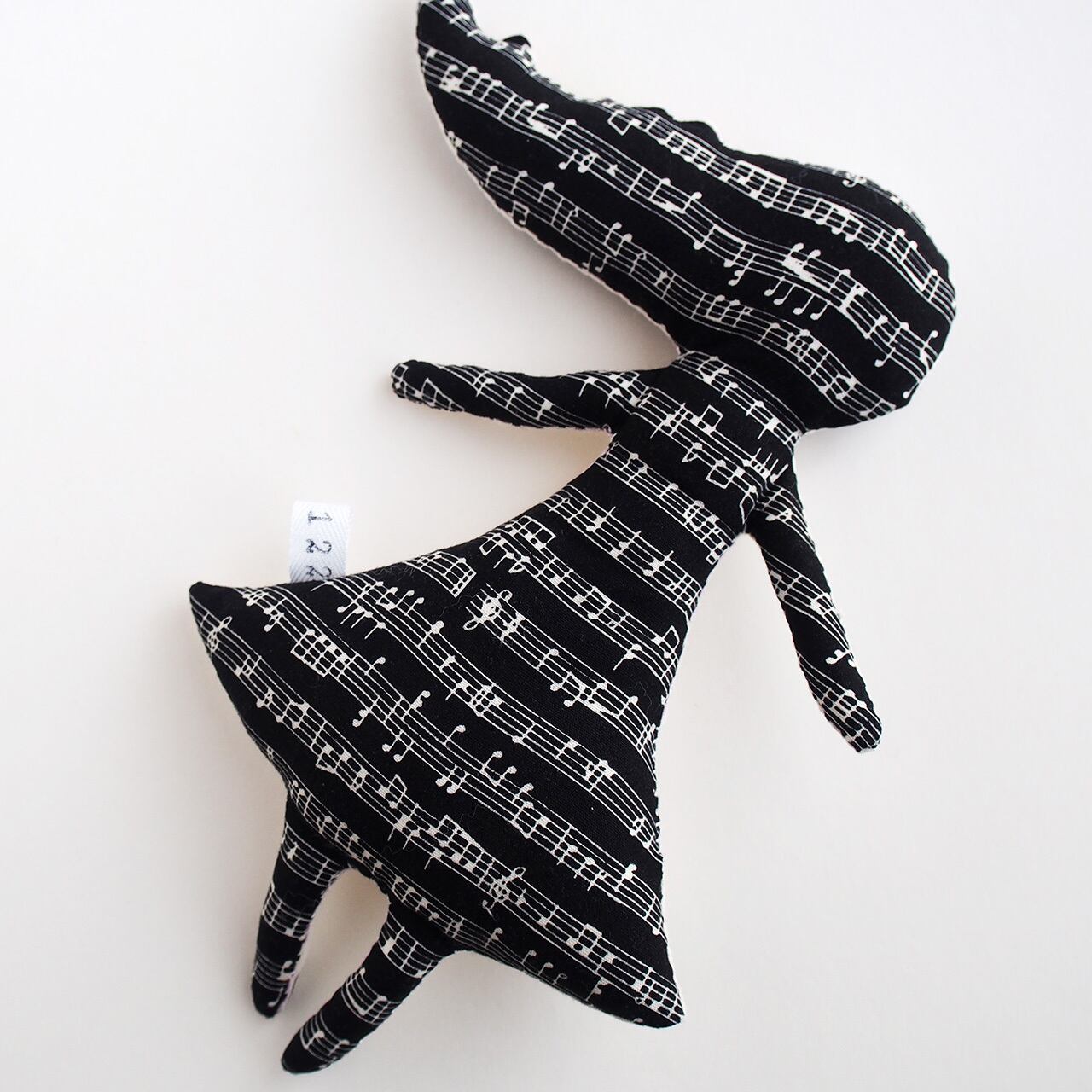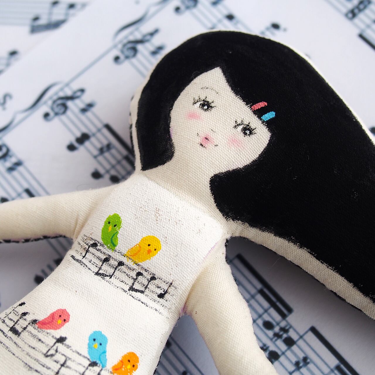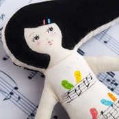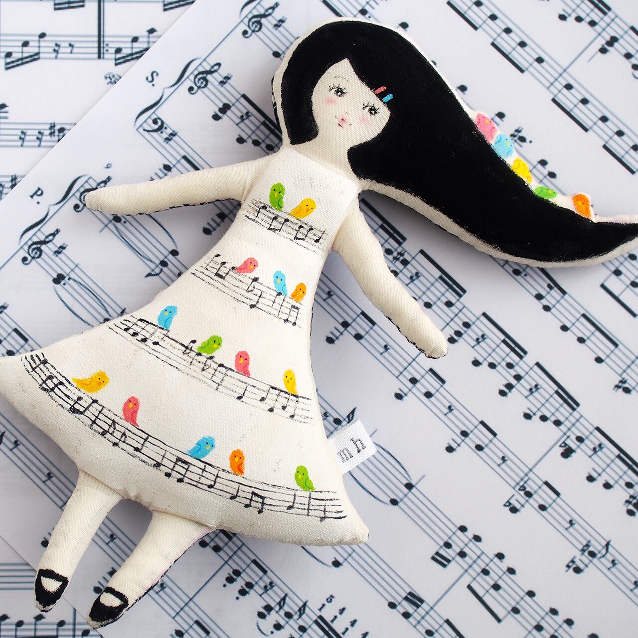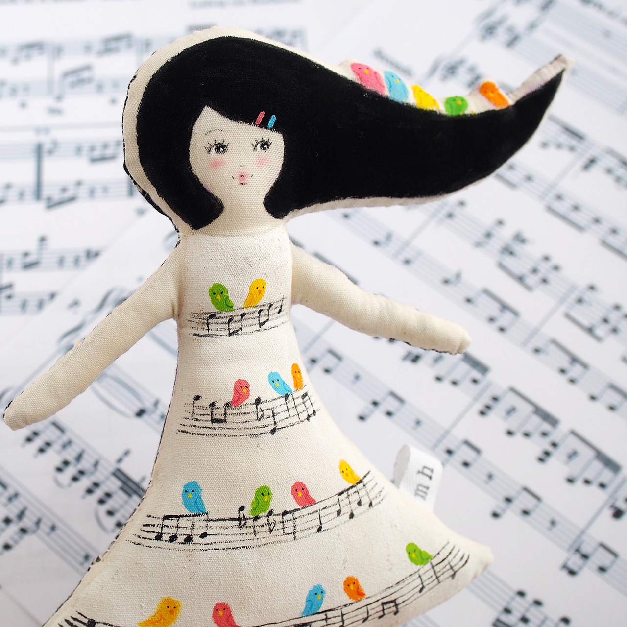 なびいた髪と、ワンピースの音符にカラフルな小鳥がとまっています。