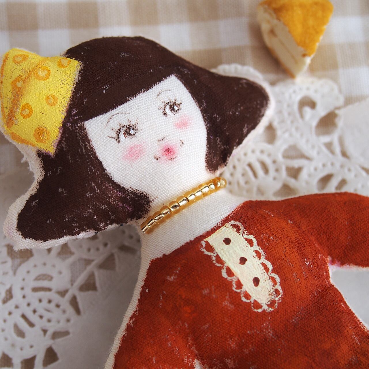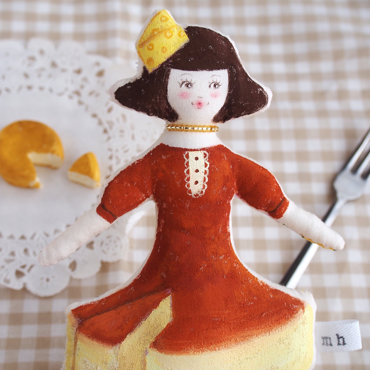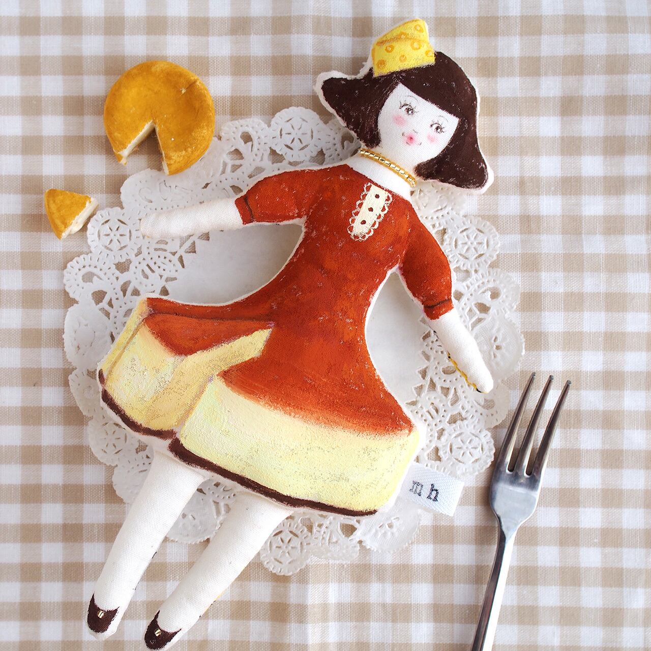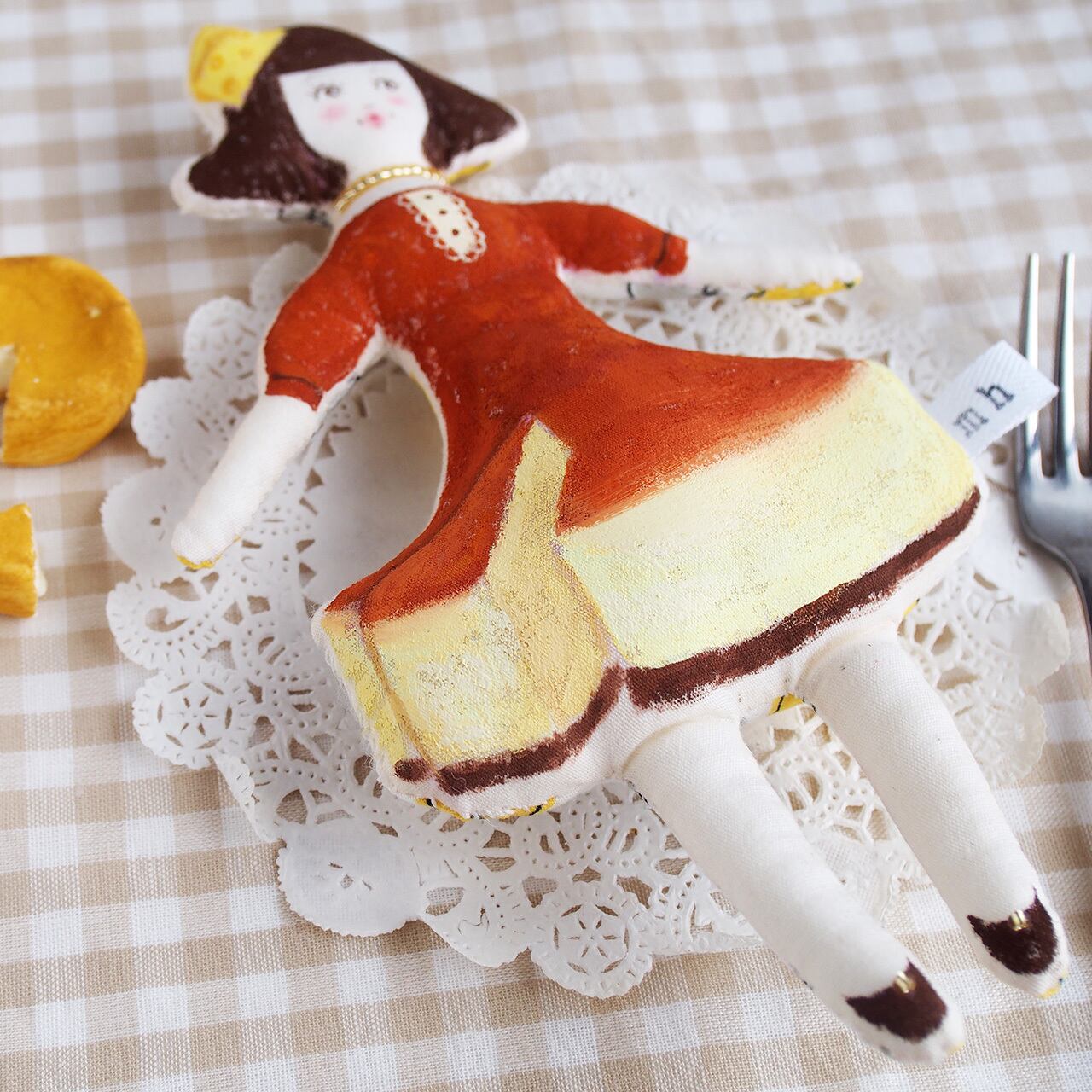 チーズの帽子をかぶり、チーズケーキのワンピースを着た女の子。