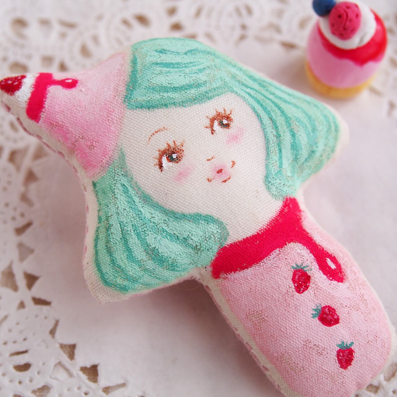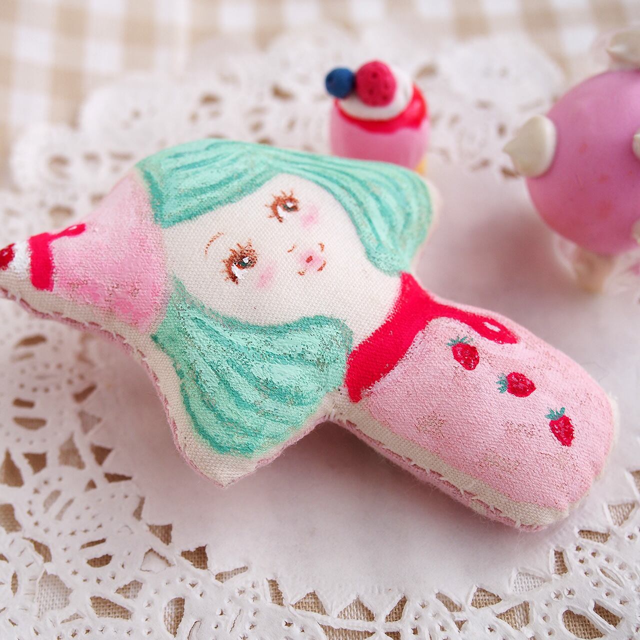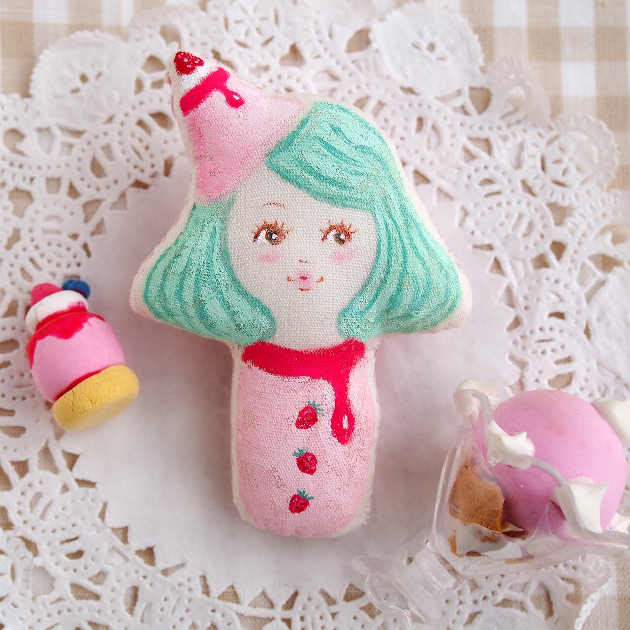 いちごプリンの帽子をかぶった女の子のブローチです。
