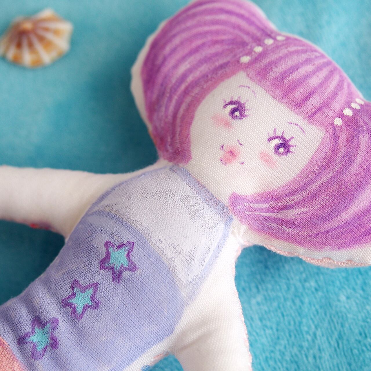 白、またはキナリの布を手縫いし、綿を入れて人形の形を作り、そこへ直接アクリル絵の具で着色しています。