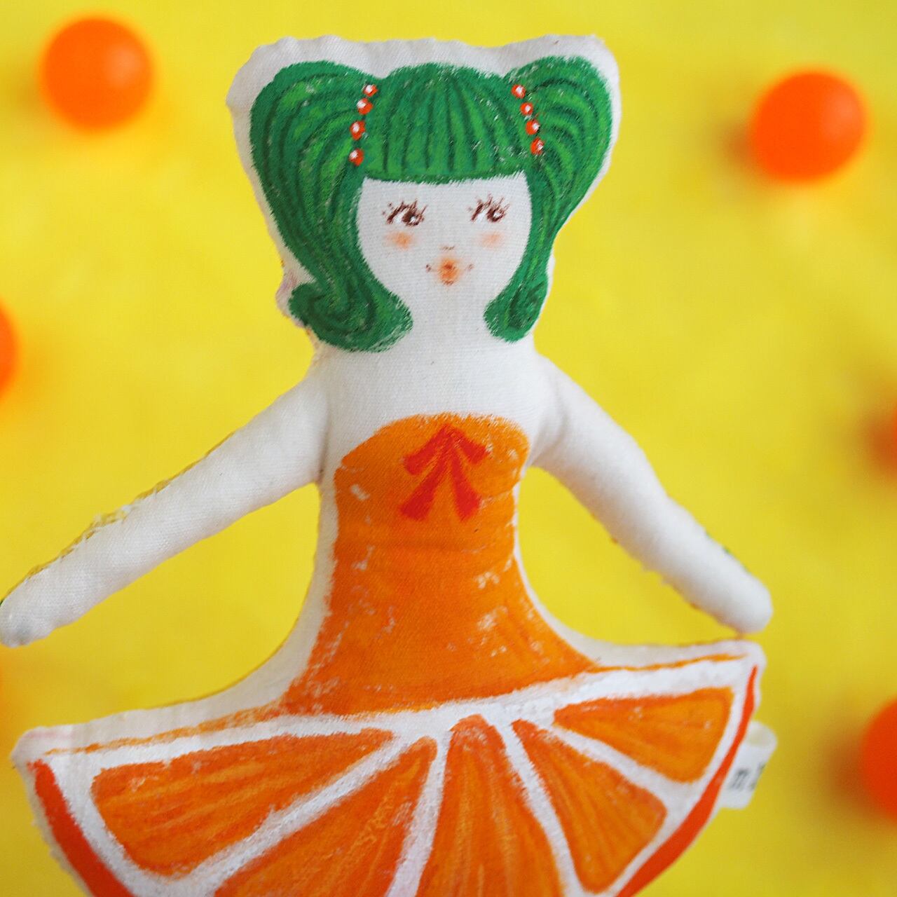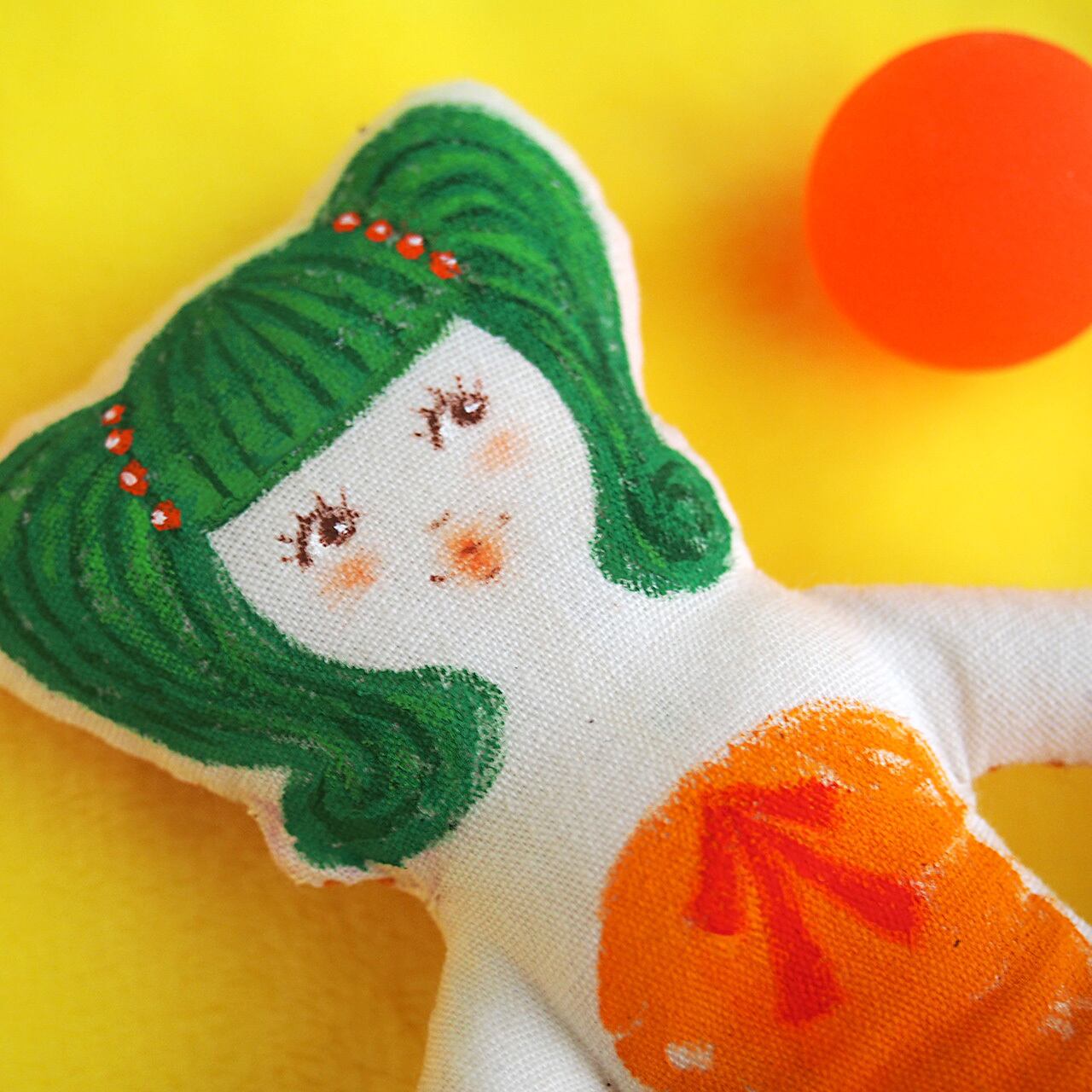白、またはキナリの布を手縫いし、綿を入れて人形の形を作り、そこへ直接アクリル絵の具で着色しています。
