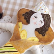 白、またはキナリの布を手縫いし、綿を入れて人形の形を作り、そこへ直接アクリル絵の具で着色しています。