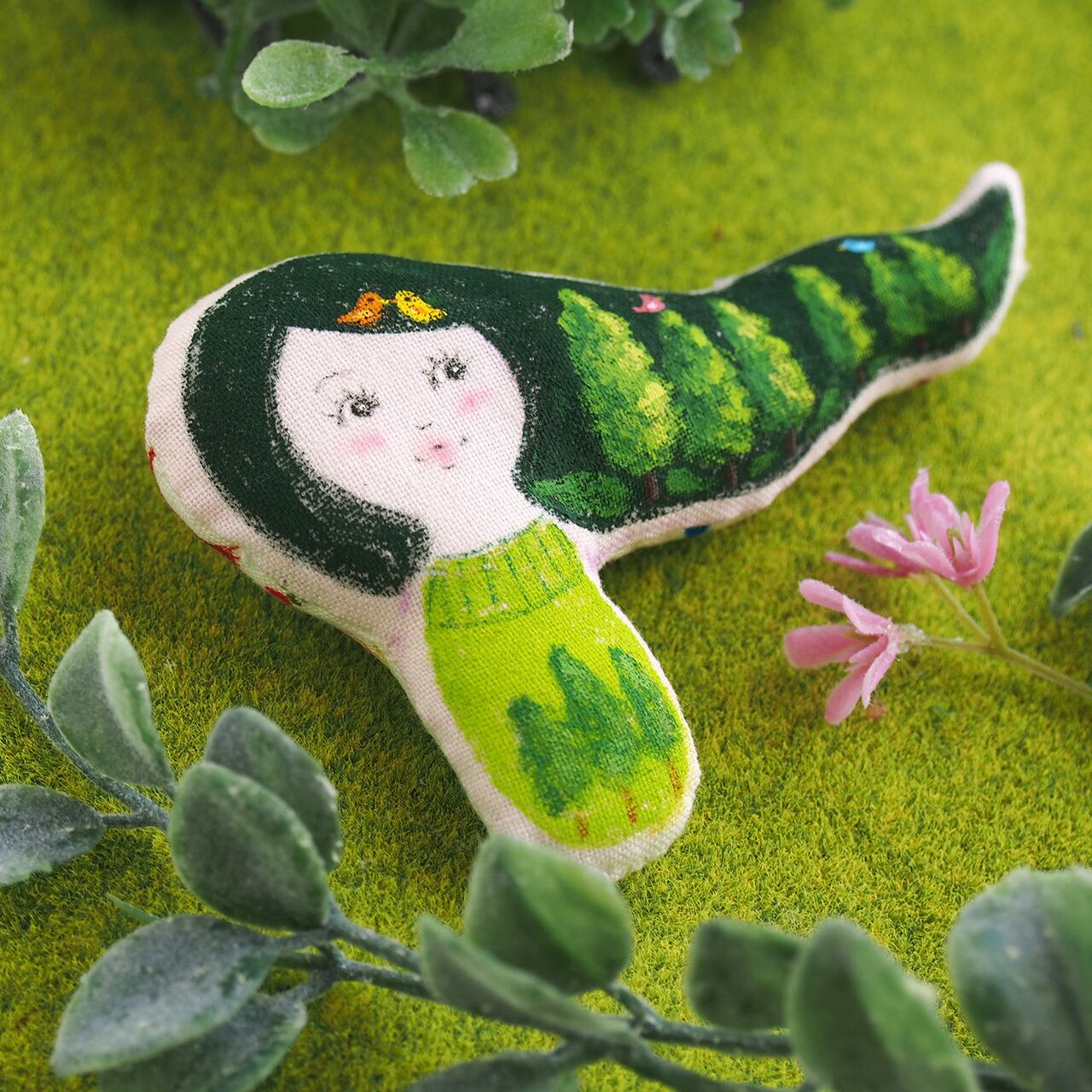 風になびくロングヘアーの中に、森が広がっているブローチです。