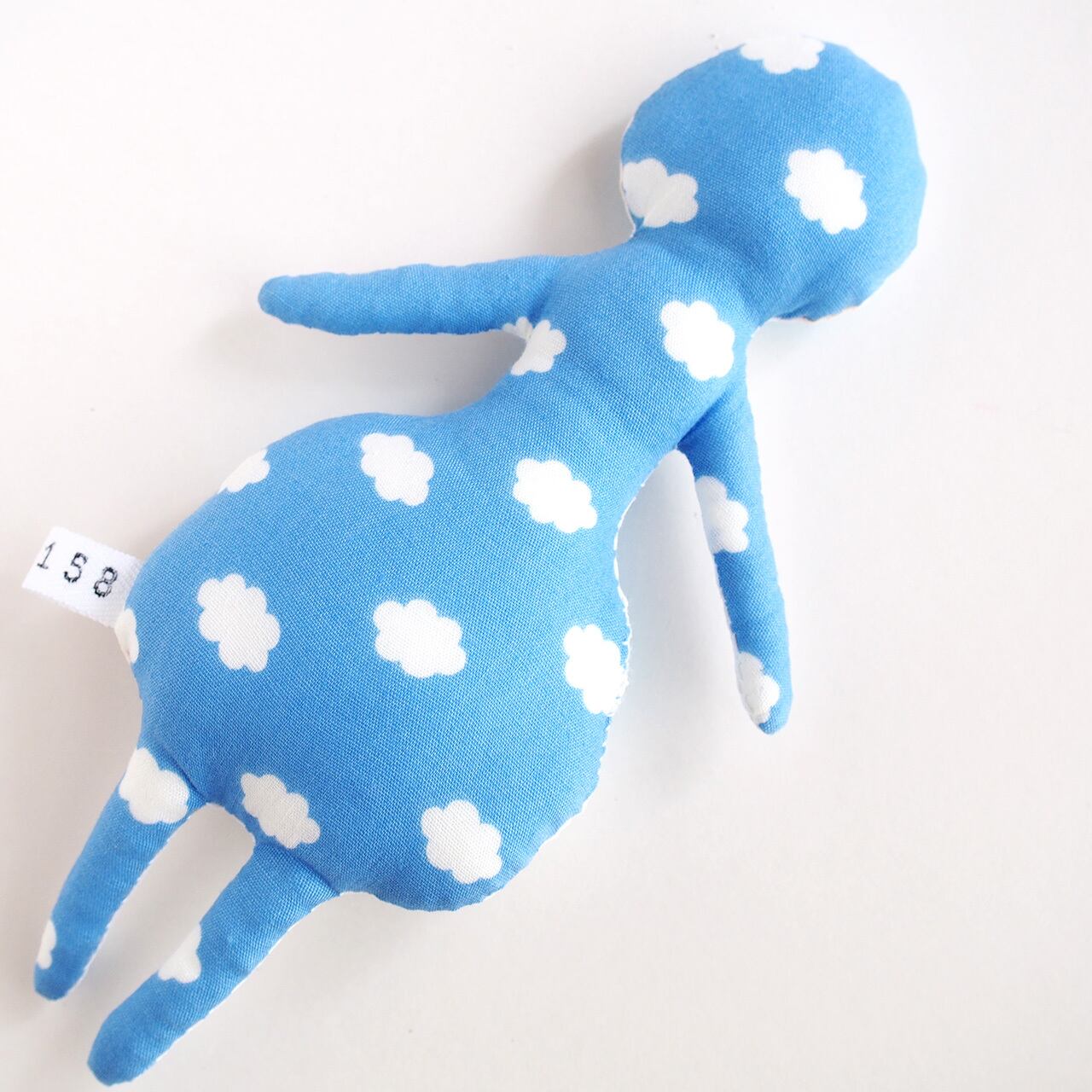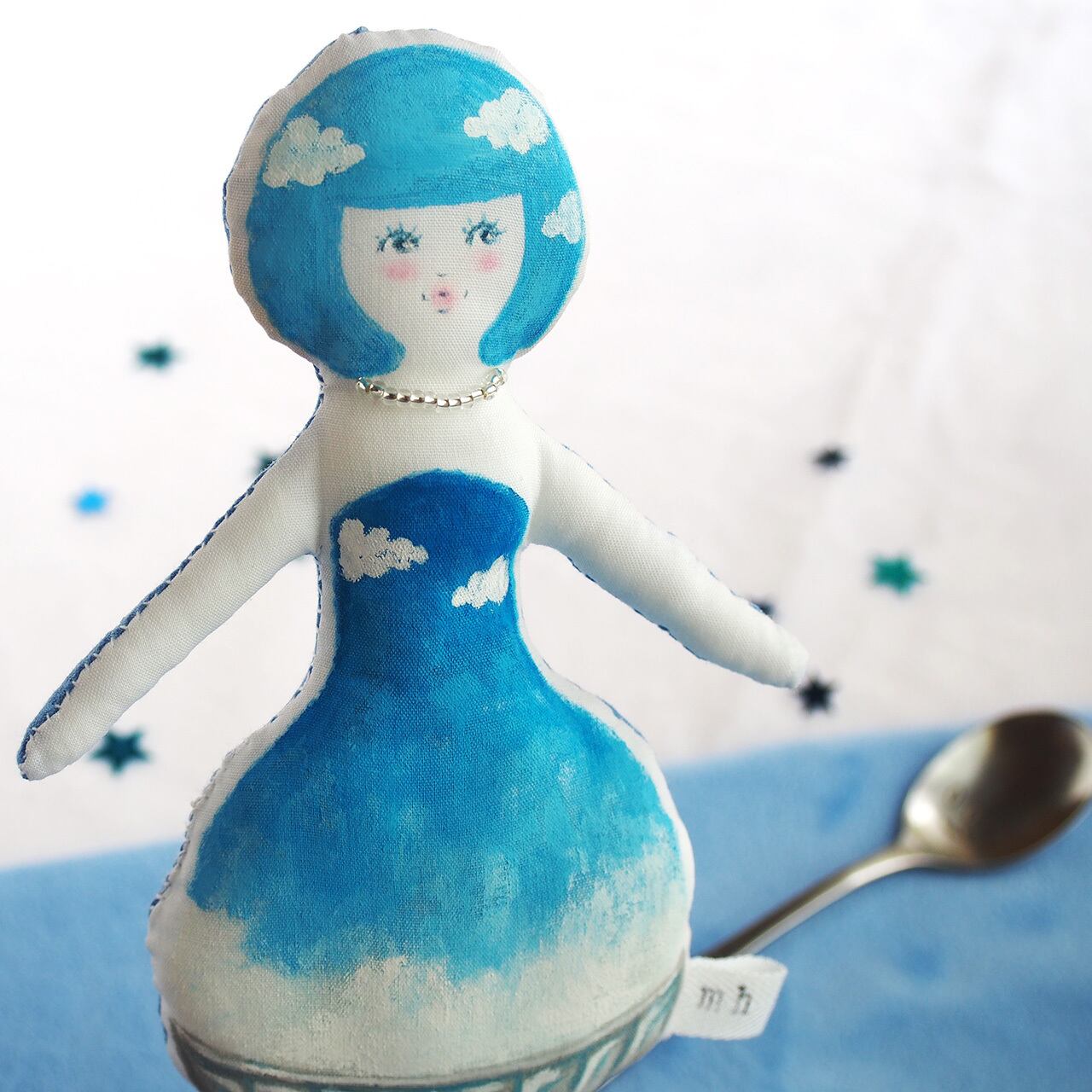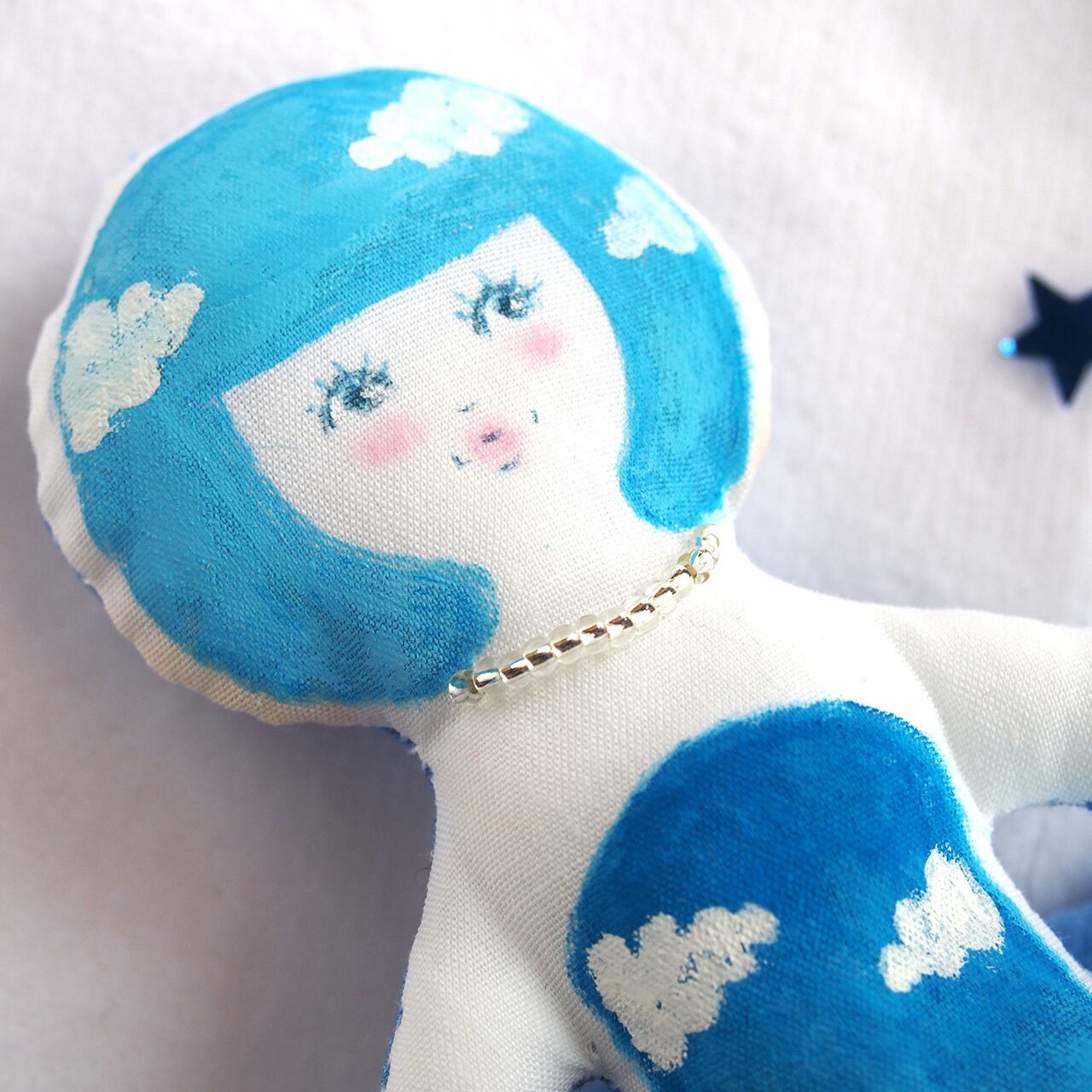 白、またはキナリの布を手縫いし、綿を入れて人形の形を作り、そこへ直接アクリル絵の具で着色しています。