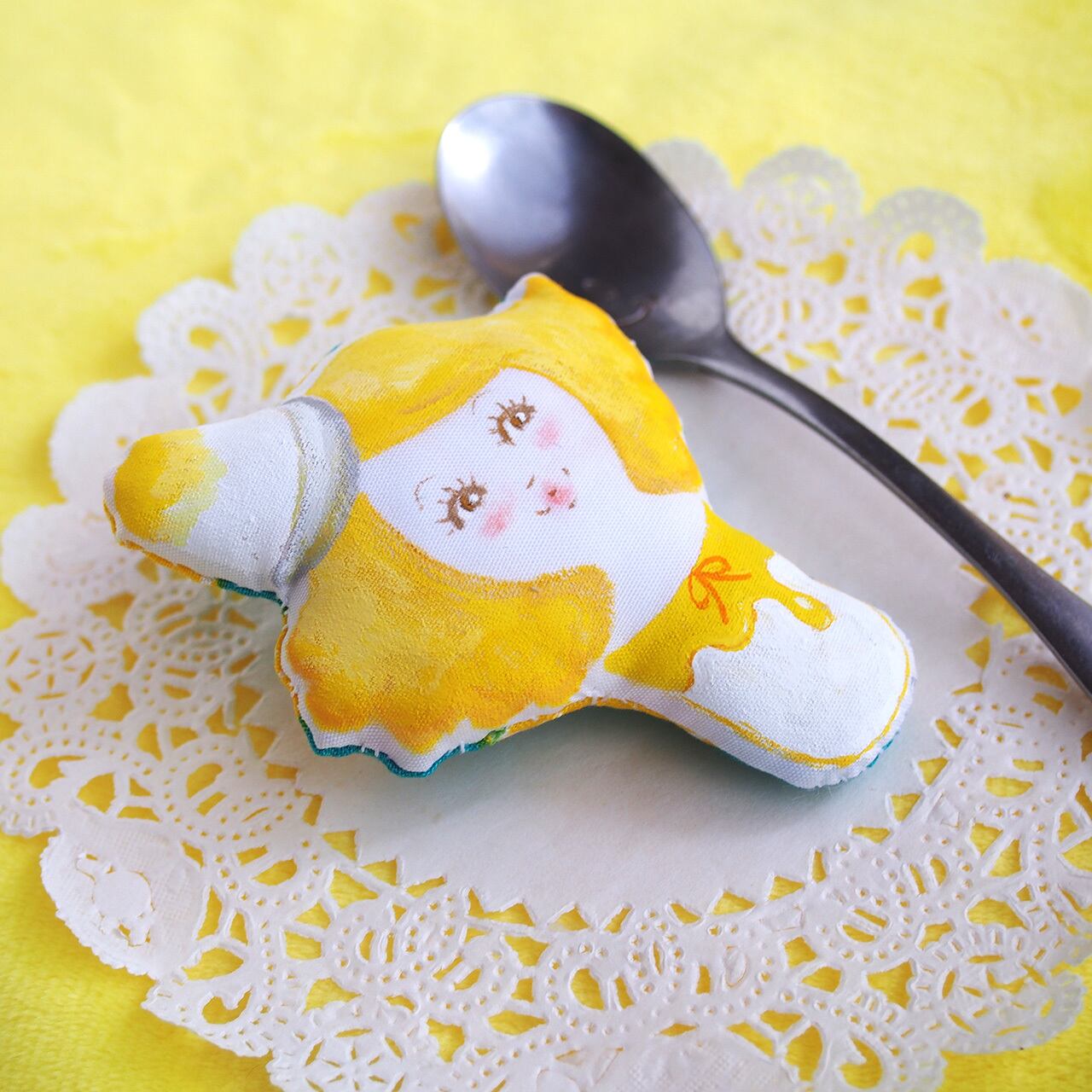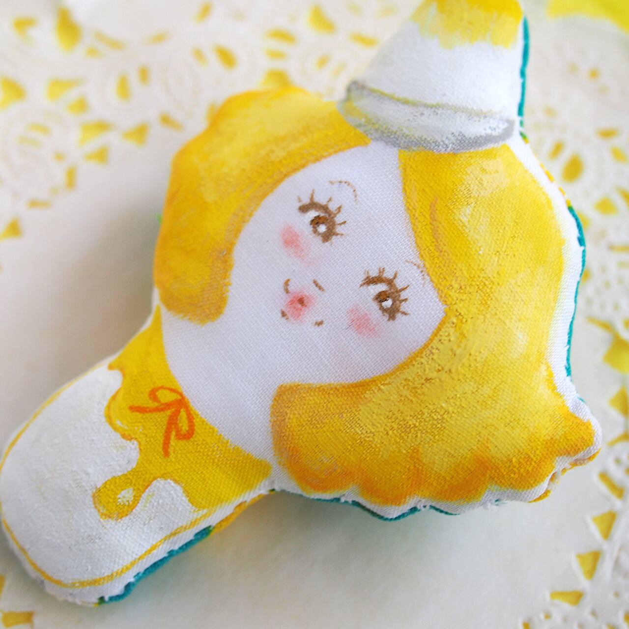 白、またはキナリの布を手縫いし、綿を入れて人形の形を作り、そこへ直接アクリル絵の具で着色しています。