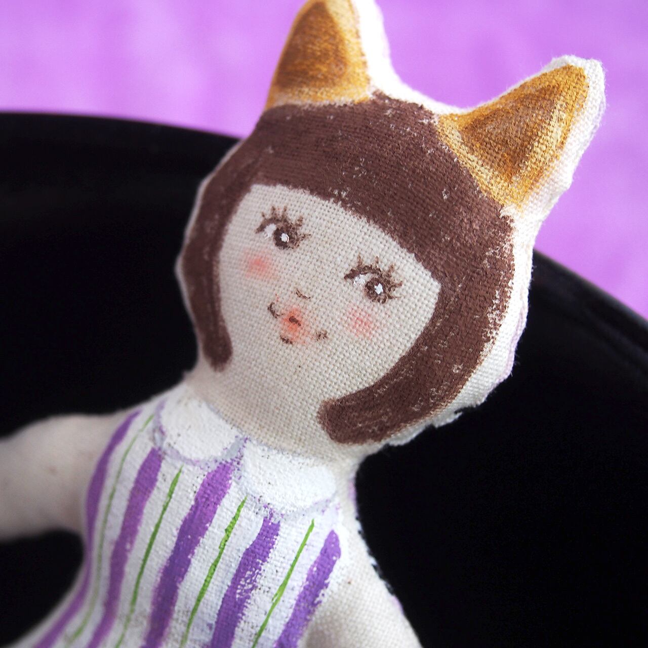 白、またはキナリの布を手縫いし、綿を入れて人形の形を作り、そこへ直接アクリル絵の具で着色しています。