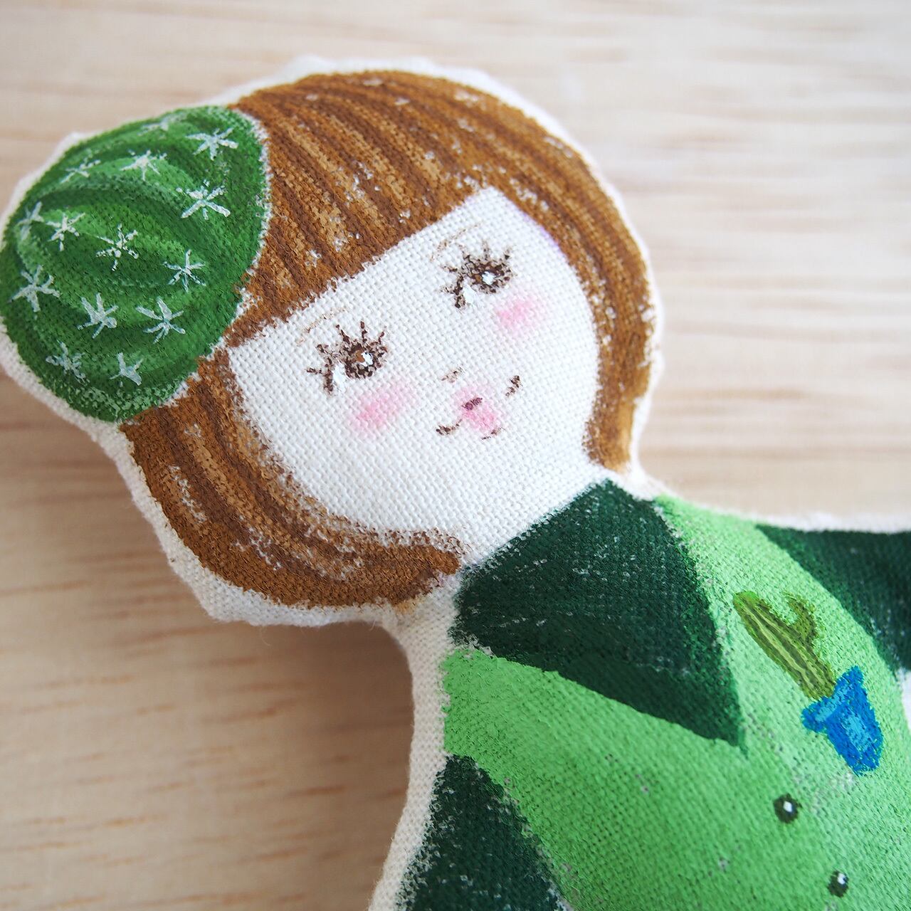 白、またはキナリの布を手縫いし、綿を入れて人形の形を作り、そこへ直接アクリル絵の具で着色しています。