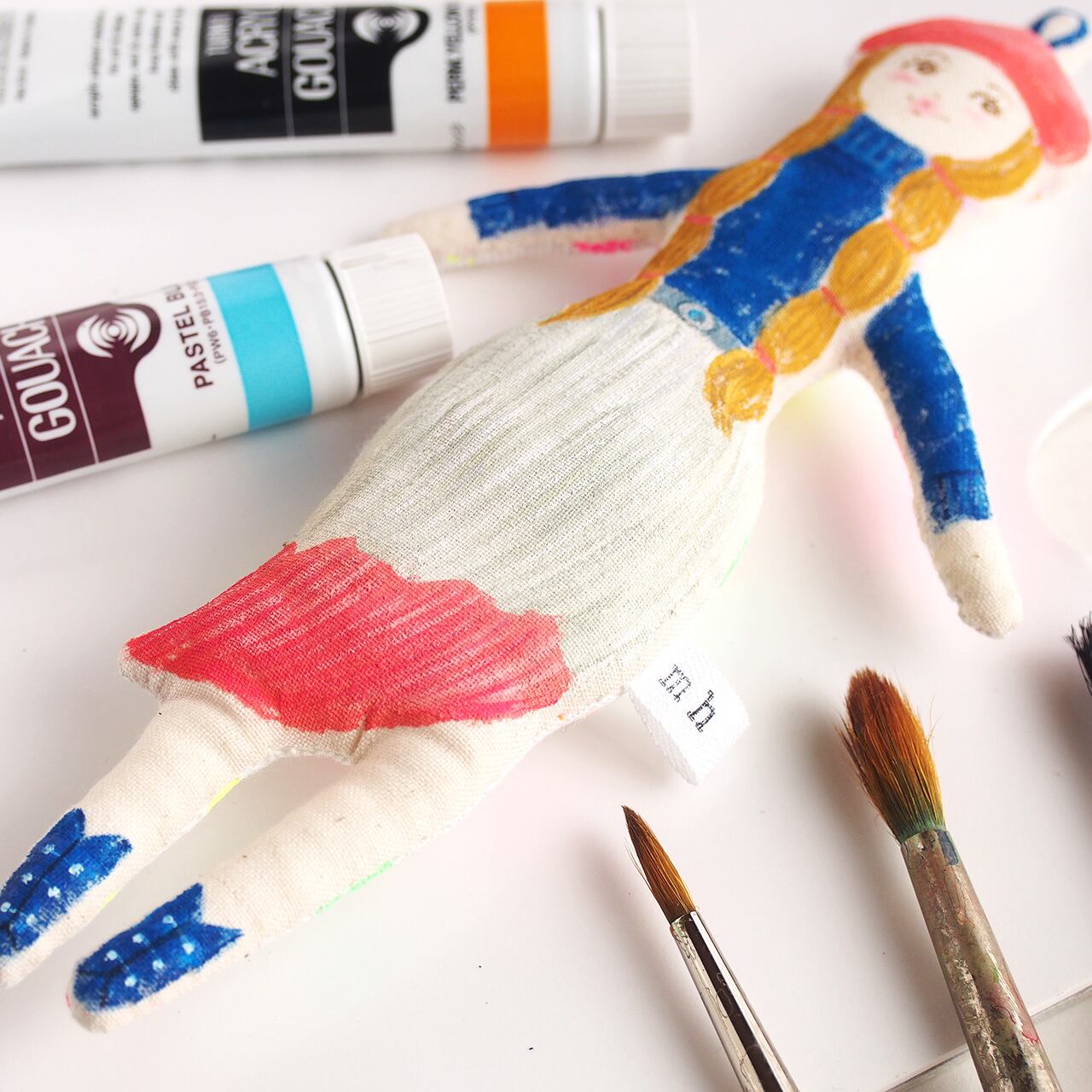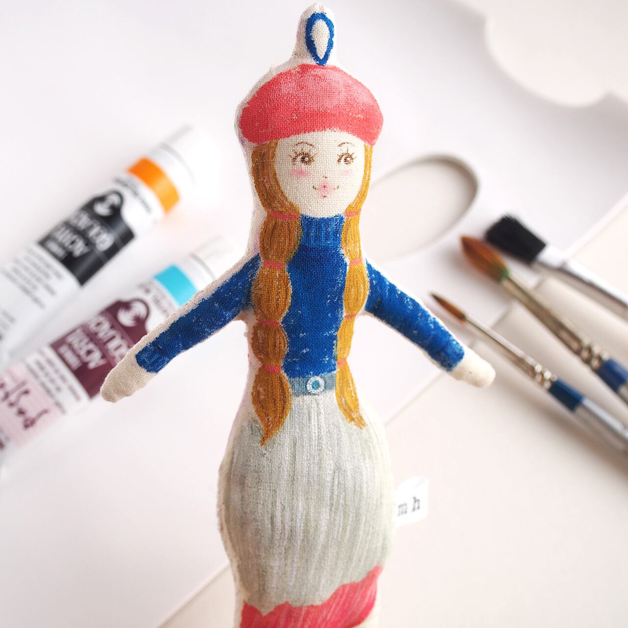 白、またはキナリの布を手縫いし、綿を入れて人形の形を作り、そこへ直接アクリル絵の具で着色しています。