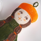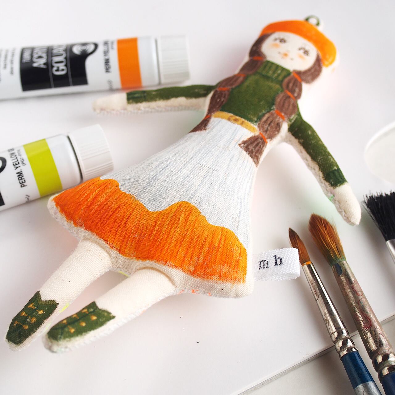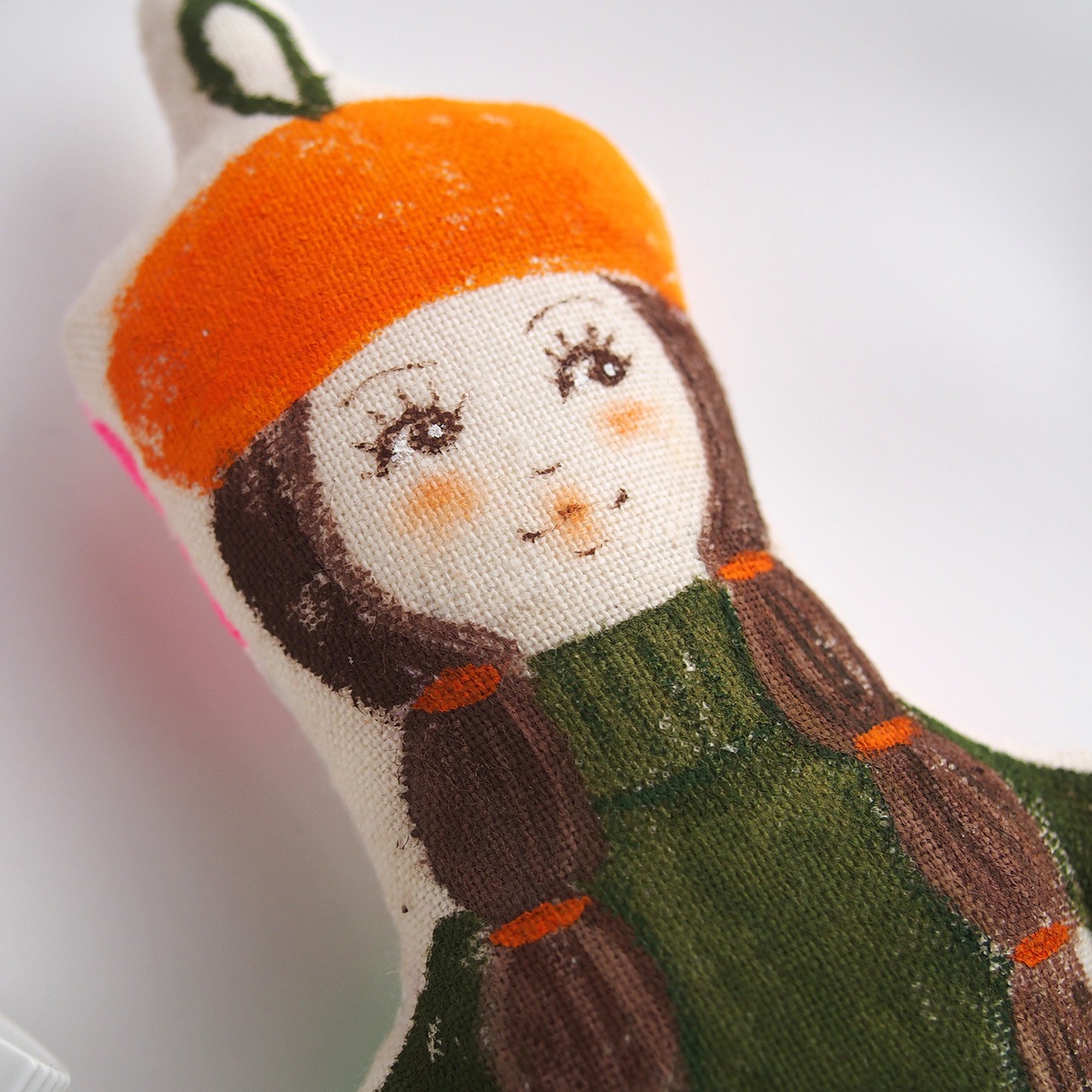 白、またはキナリの布を手縫いし、綿を入れて人形の形を作り、そこへ直接アクリル絵の具で着色しています。