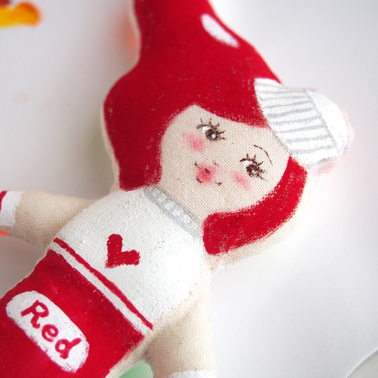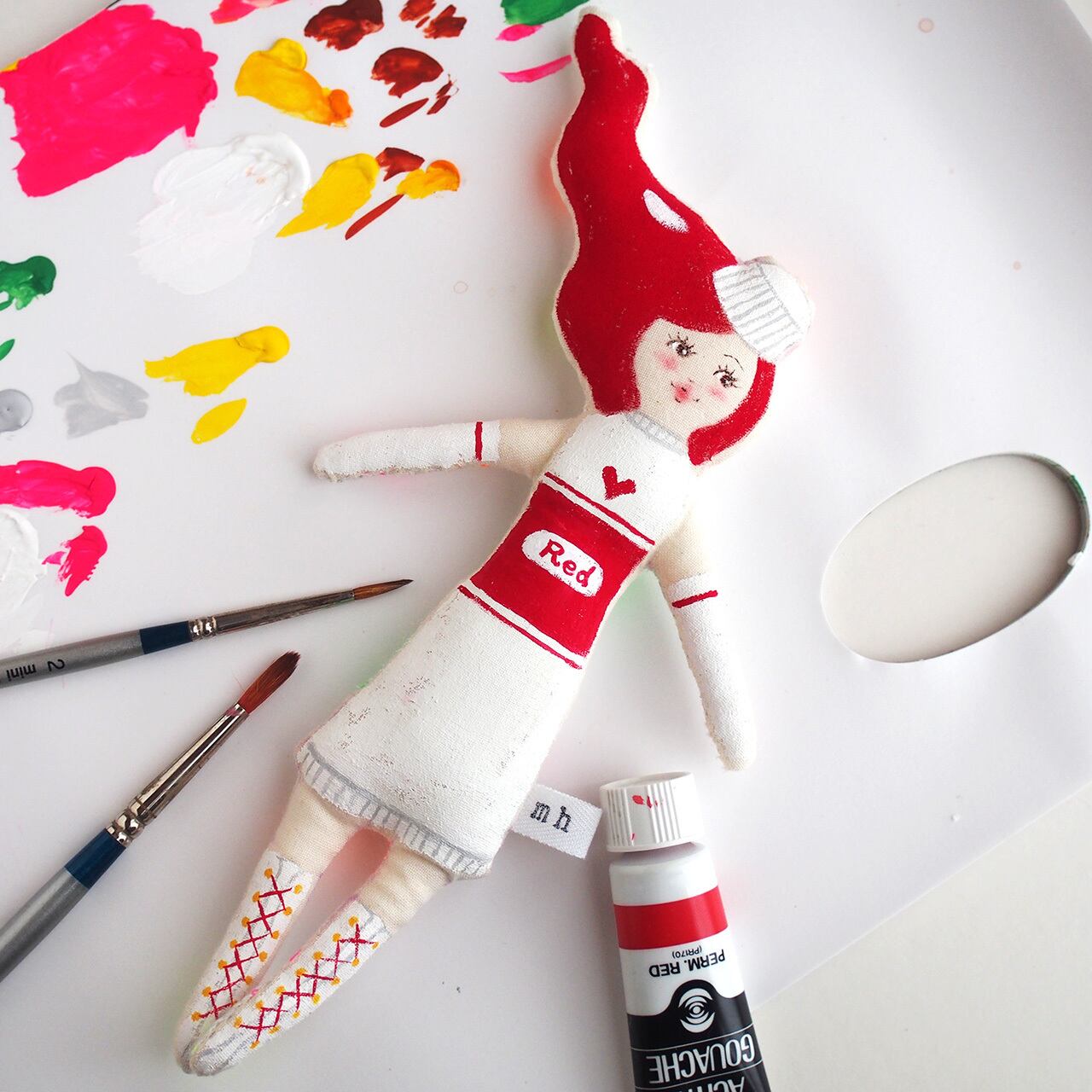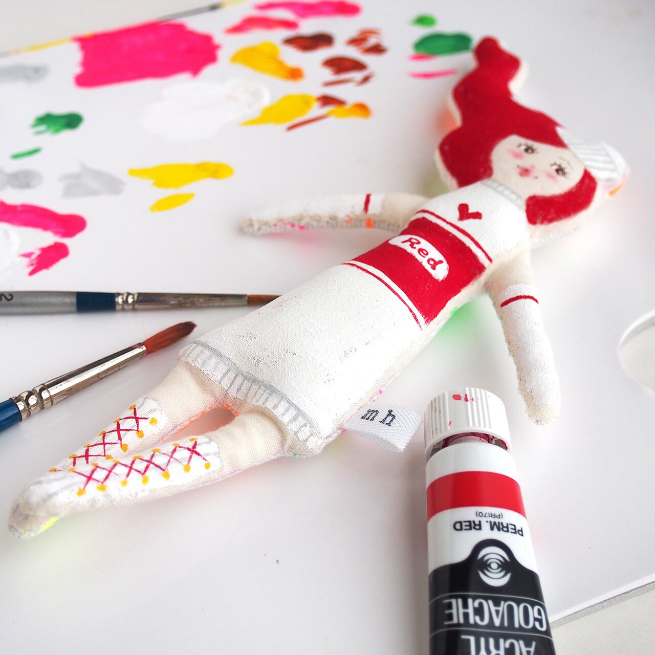 白、またはキナリの布を手縫いし、綿を入れて人形の形を作り、そこへ直接アクリル絵の具で着色しています。