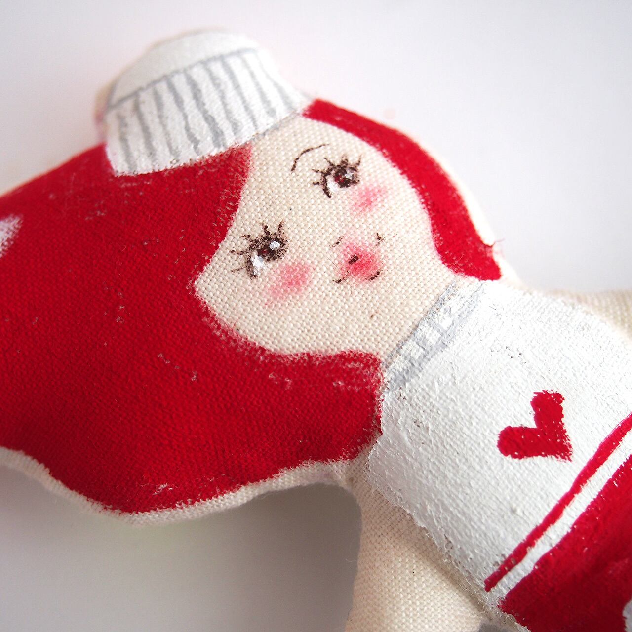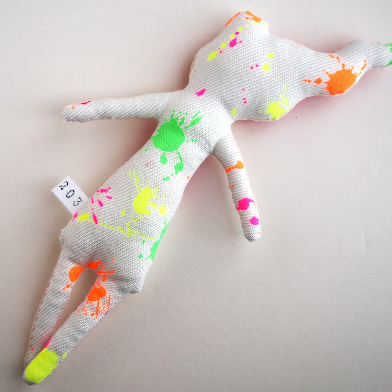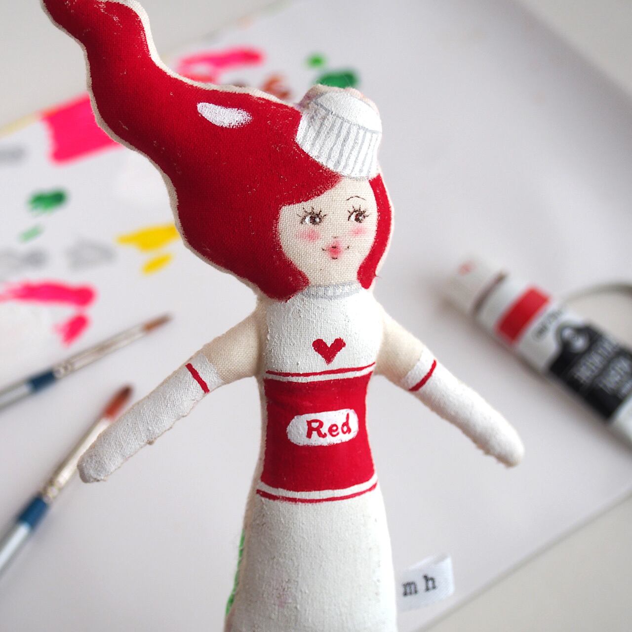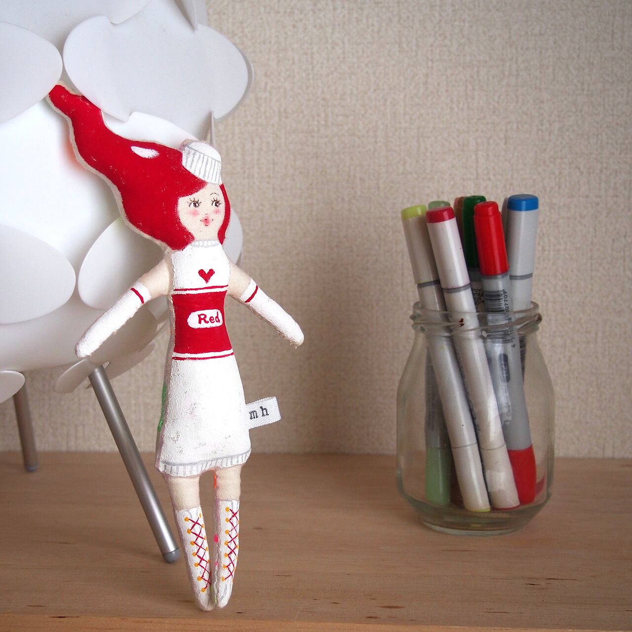 白、またはキナリの布を手縫いし、綿を入れて人形の形を作り、そこへ直接アクリル絵の具で着色しています。