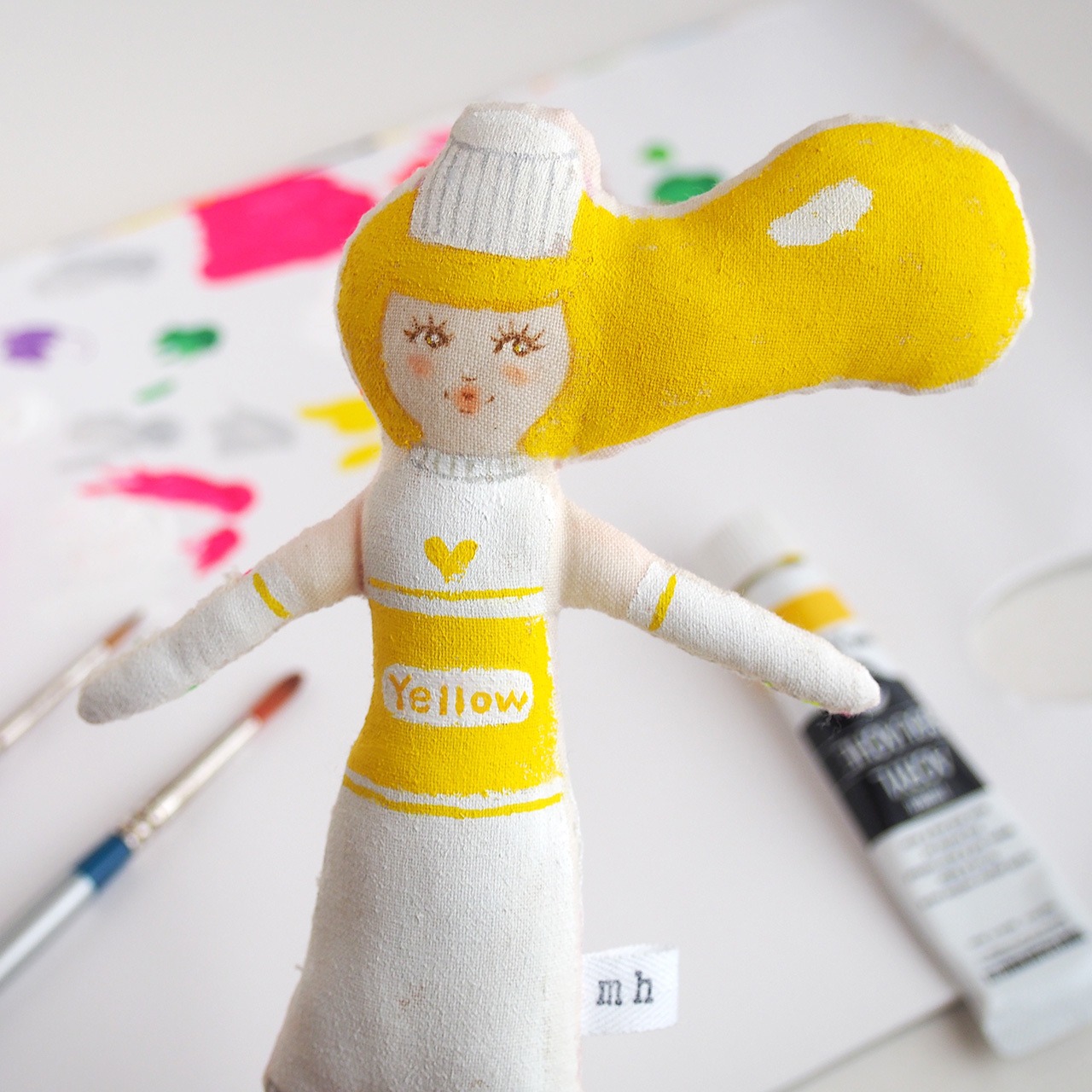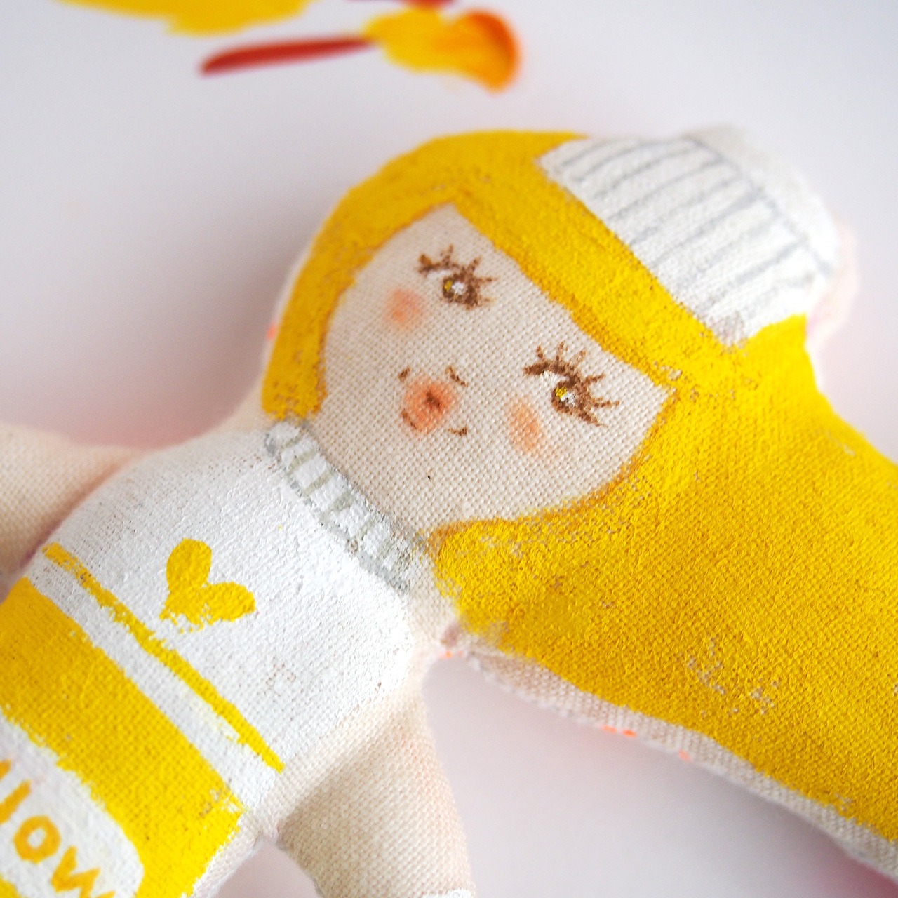 白、またはキナリの布を手縫いし、綿を入れて人形の形を作り、そこへ直接アクリル絵の具で着色しています。