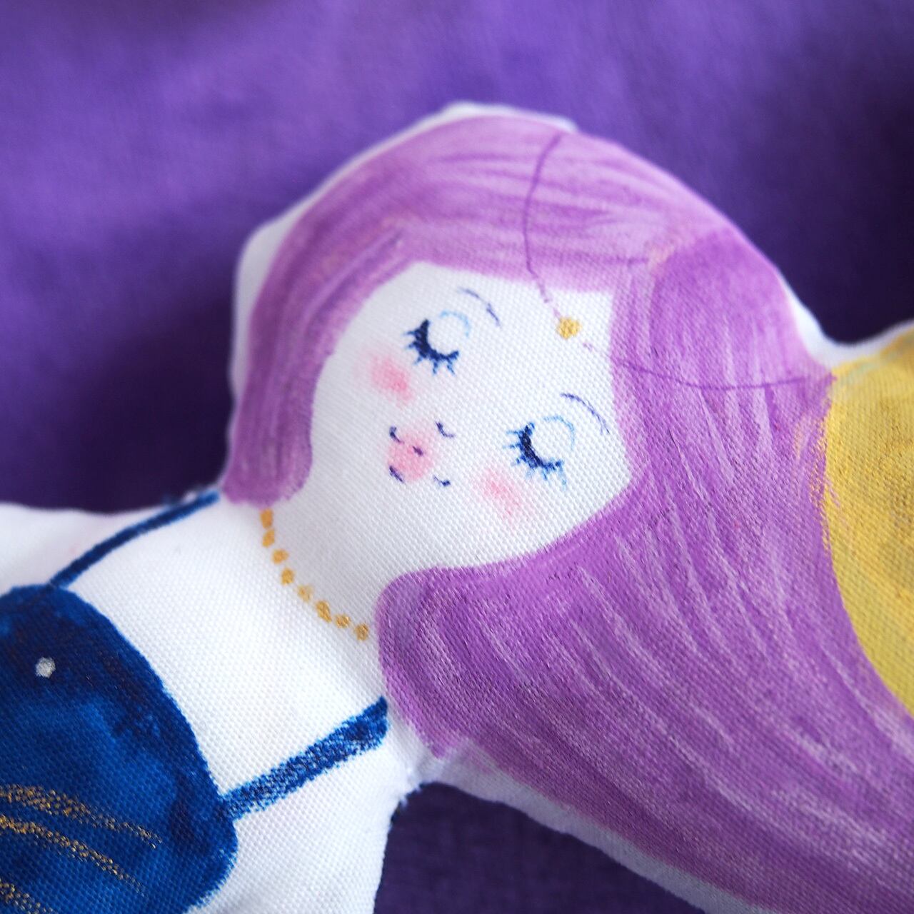 白、またはキナリの布を手縫いし、綿を入れて人形の形を作り、そこへ直接アクリル絵の具で着色しています。