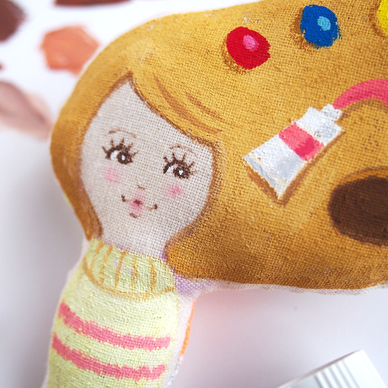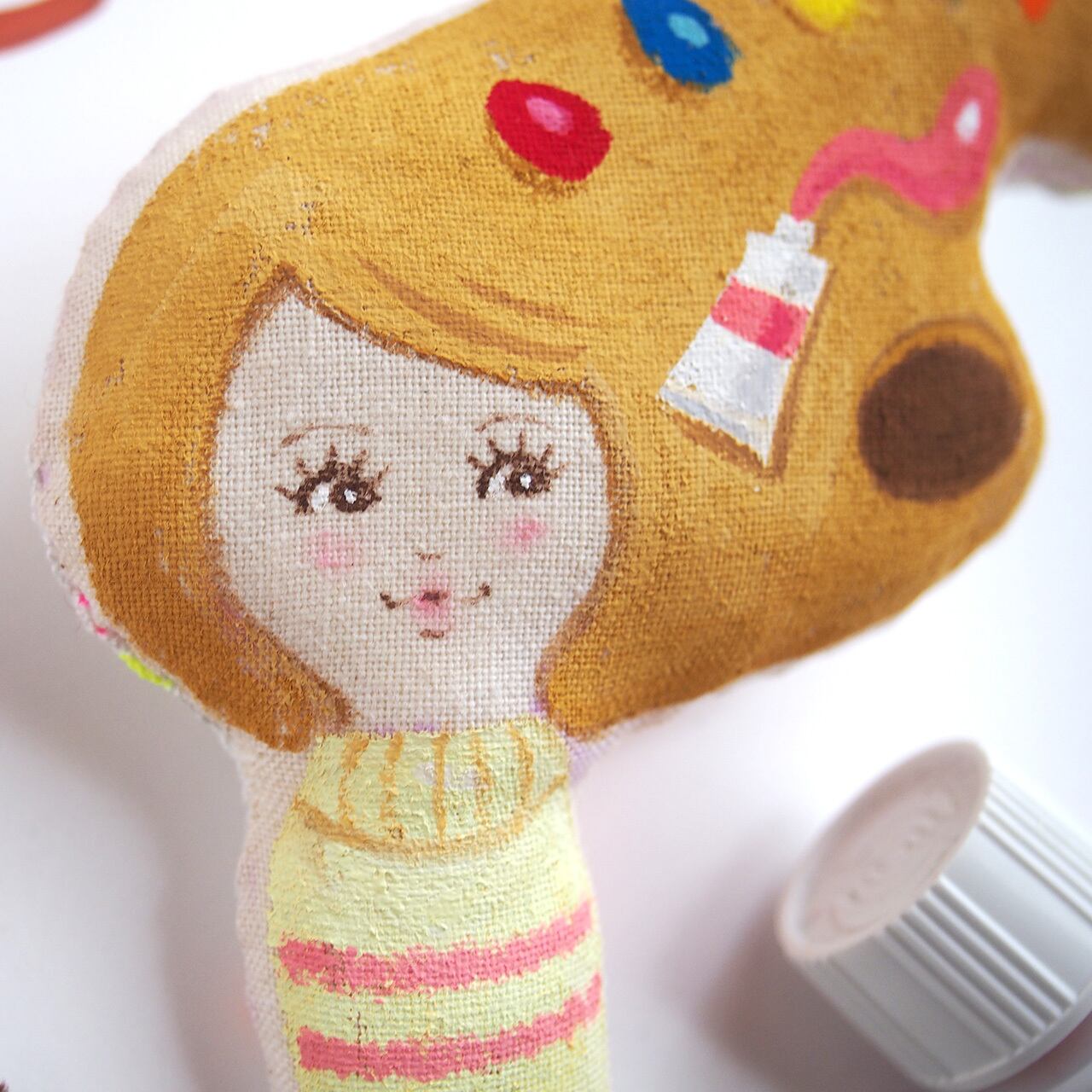 白、またはキナリの布を手縫いし、綿を入れて人形の形を作り、そこへ直接アクリル絵の具で着色しています。