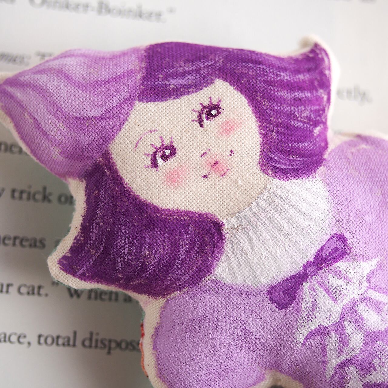 白、またはキナリの布を手縫いし、綿を入れて人形の形を作り、そこへ直接アクリル絵の具で着色しています。