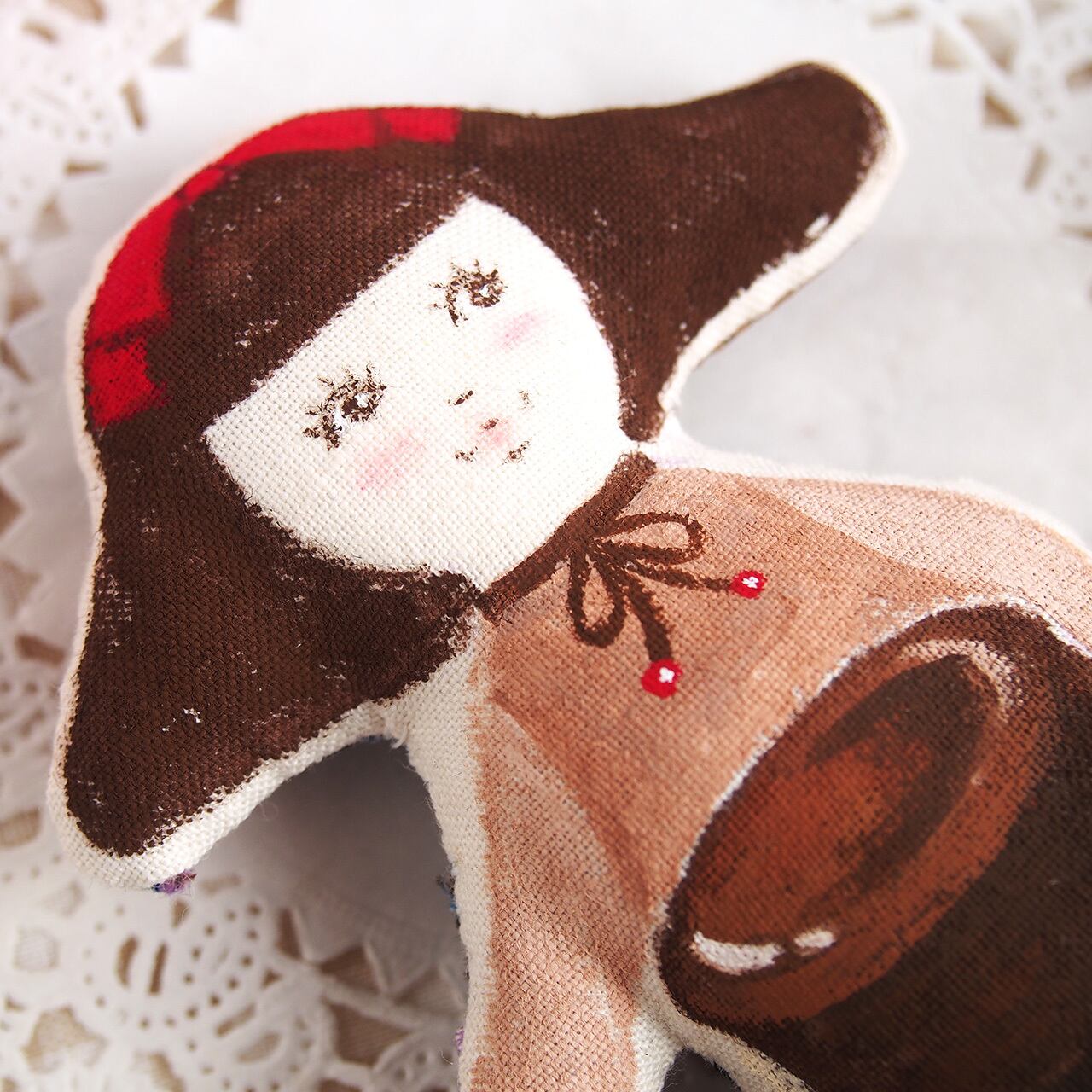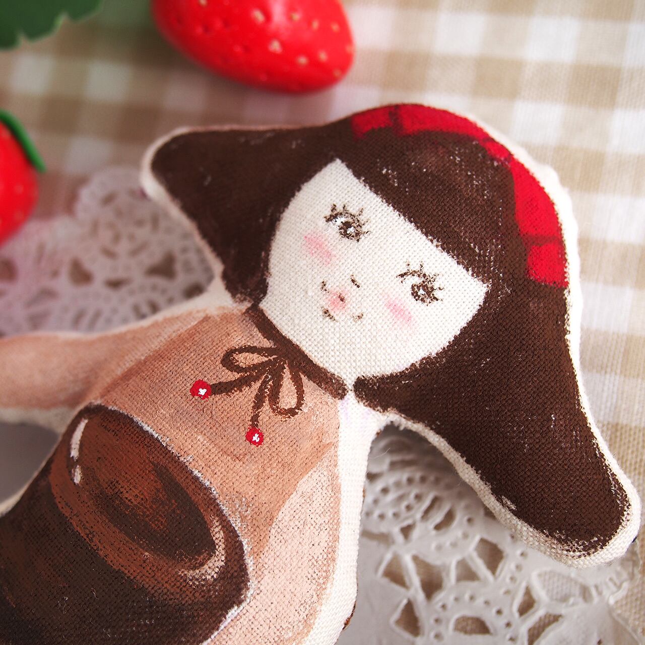 白、またはキナリの布を手縫いし、綿を入れて人形の形を作り、そこへ直接アクリル絵の具で着色しています。