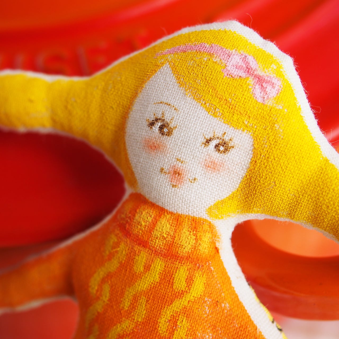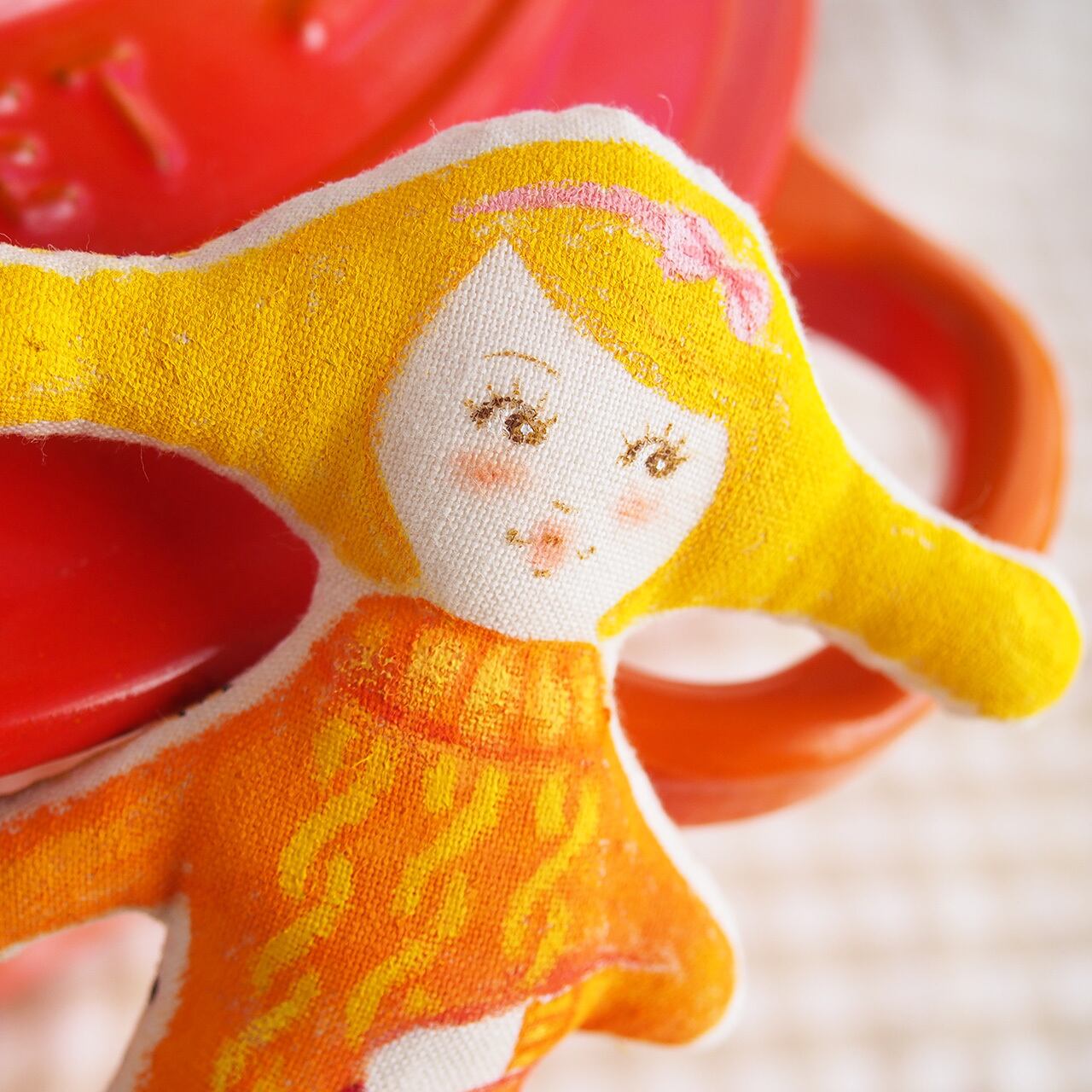 白、またはキナリの布を手縫いし、綿を入れて人形の形を作り、そこへ直接アクリル絵の具で着色しています。