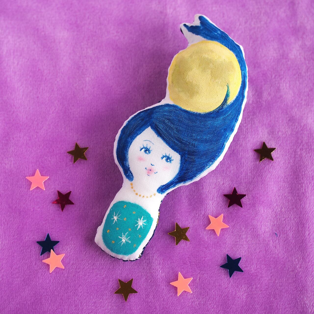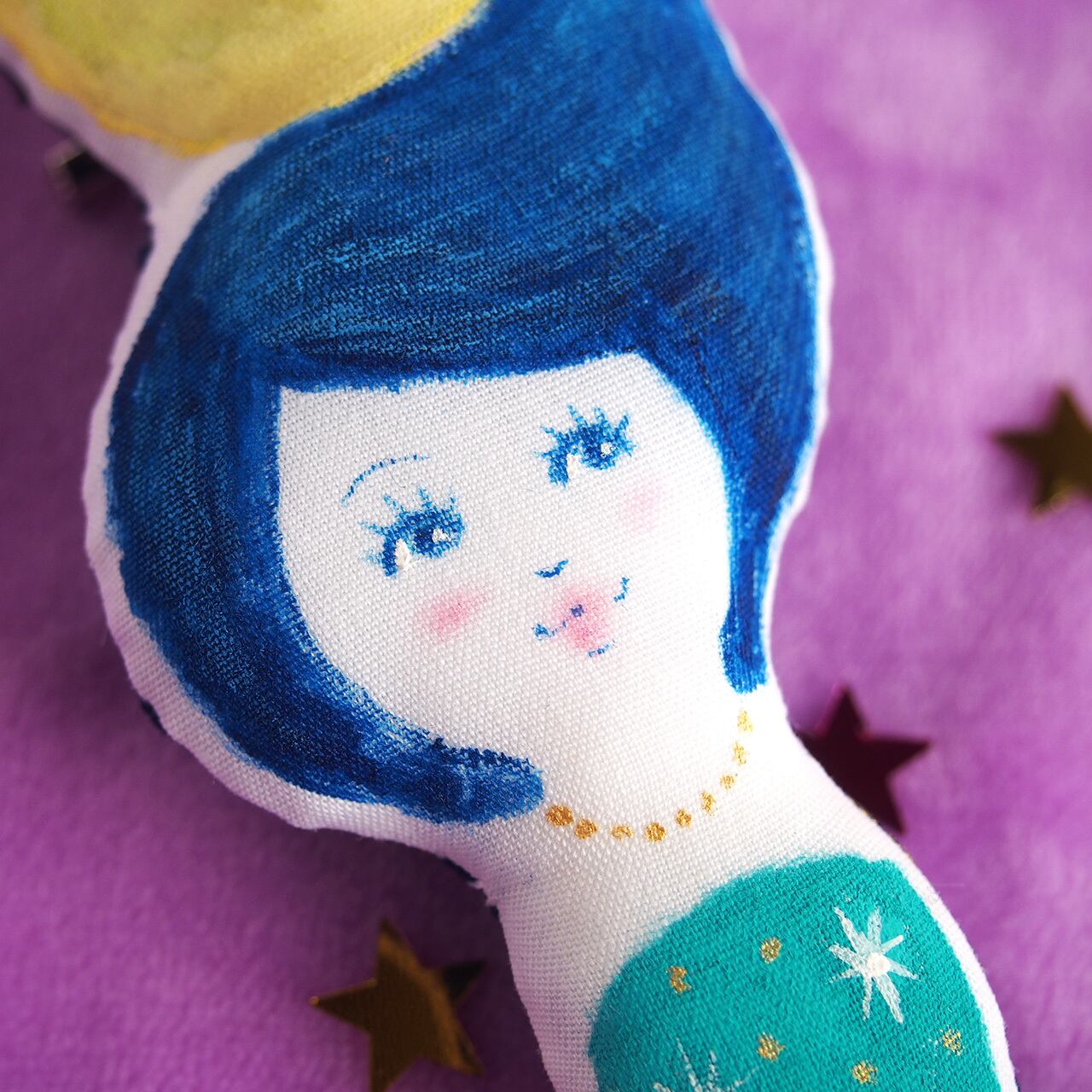 白、またはキナリの布を手縫いし、綿を入れて人形の形を作り、そこへ直接アクリル絵の具で着色しています。