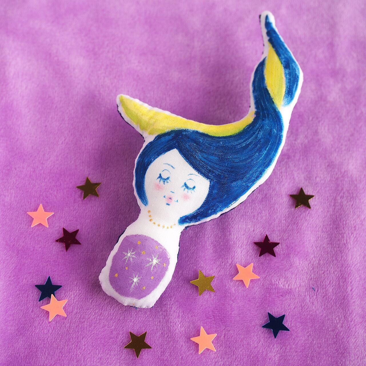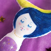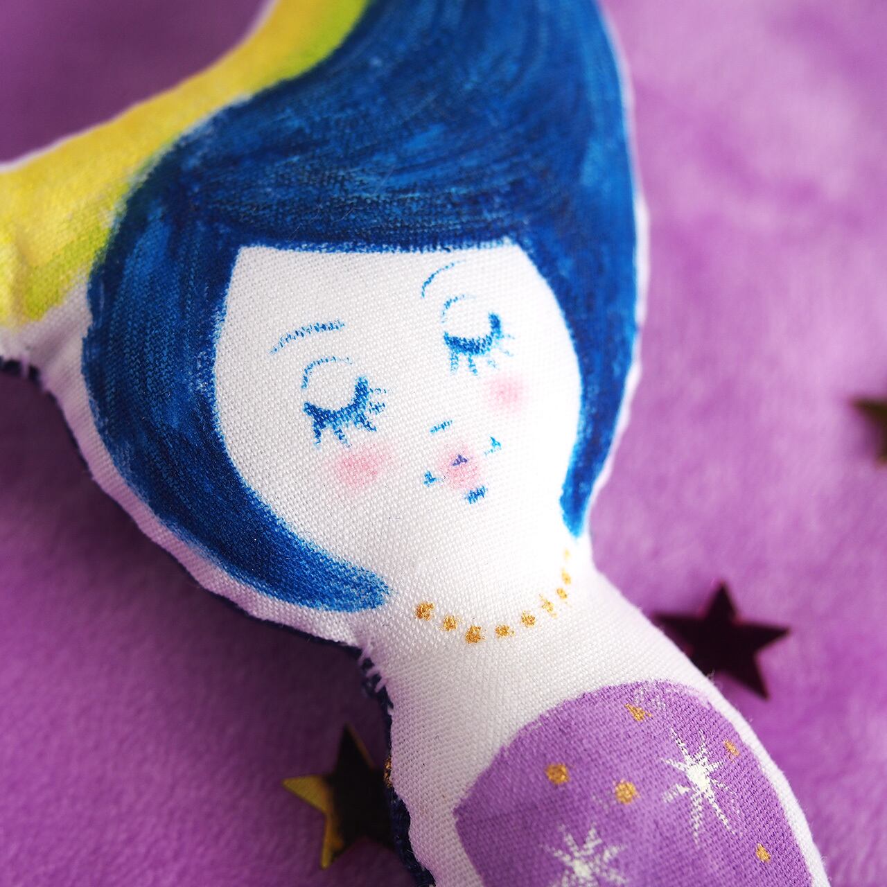 白、またはキナリの布を手縫いし、綿を入れて人形の形を作り、そこへ直接アクリル絵の具で着色しています。