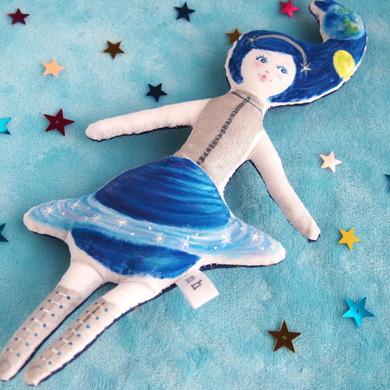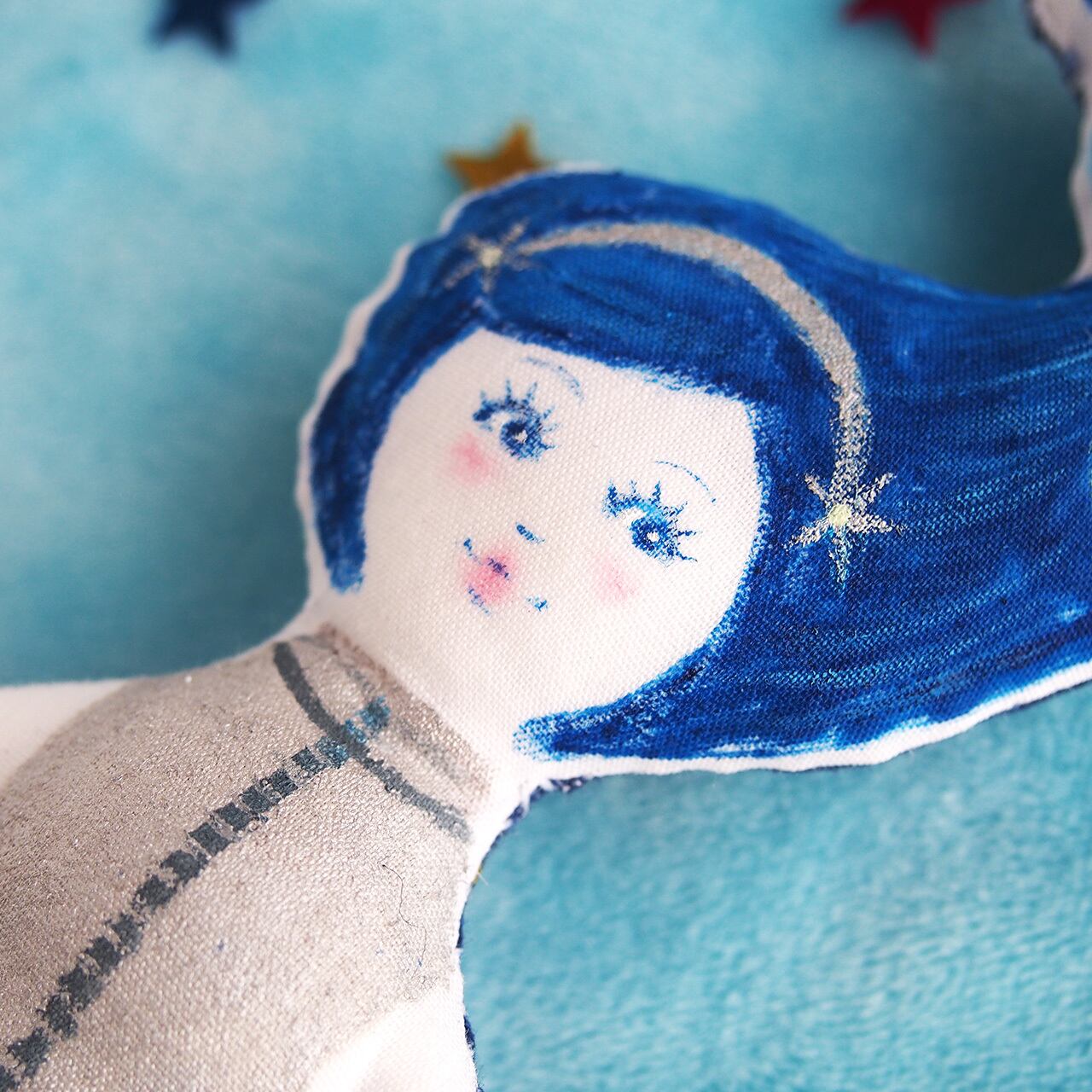 白、またはキナリの布を手縫いし、綿を入れて人形の形を作り、そこへ直接アクリル絵の具で着色しています。