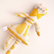 白、またはキナリの布を手縫いし、綿を入れて人形の形を作り、そこへ直接アクリル絵の具で着色しています。
