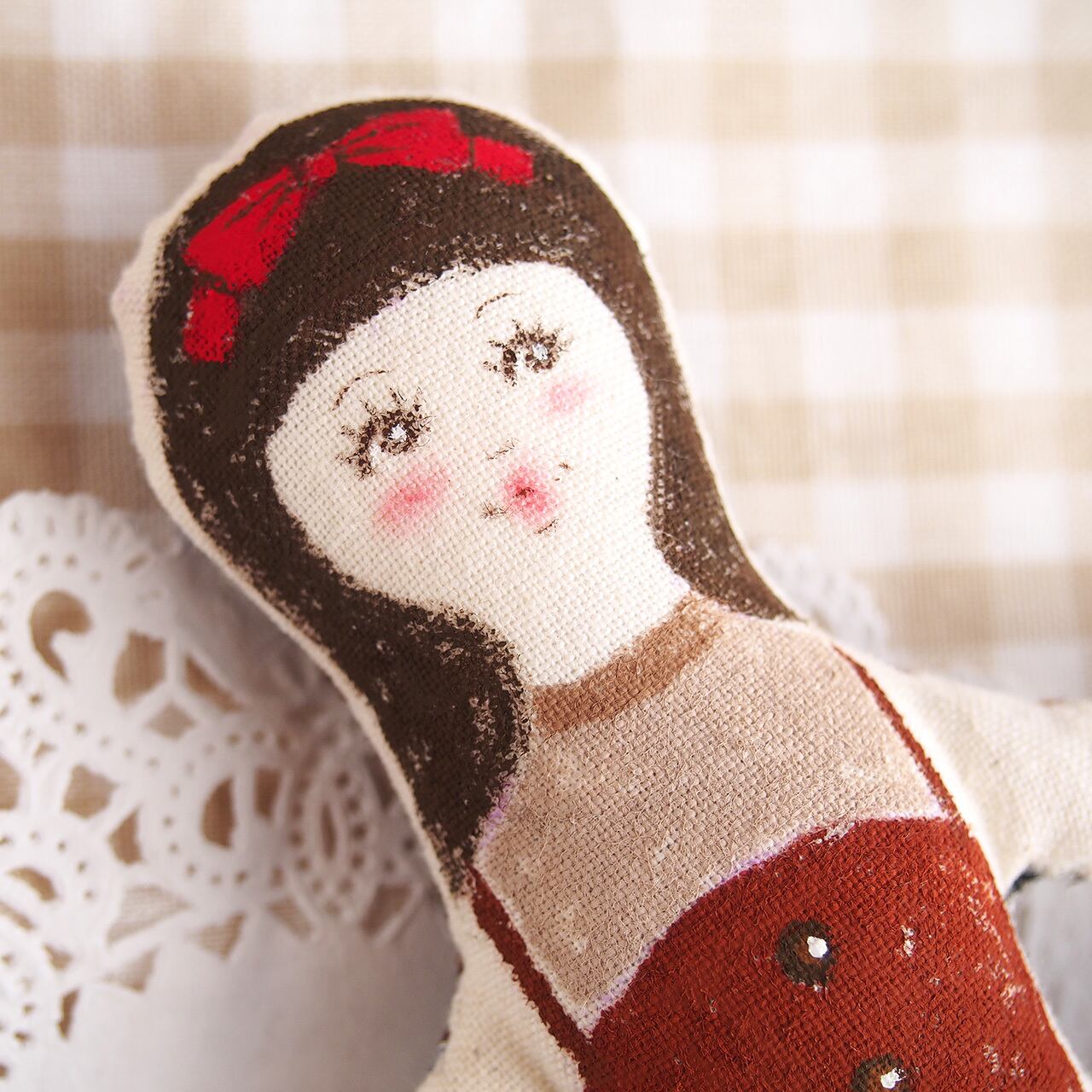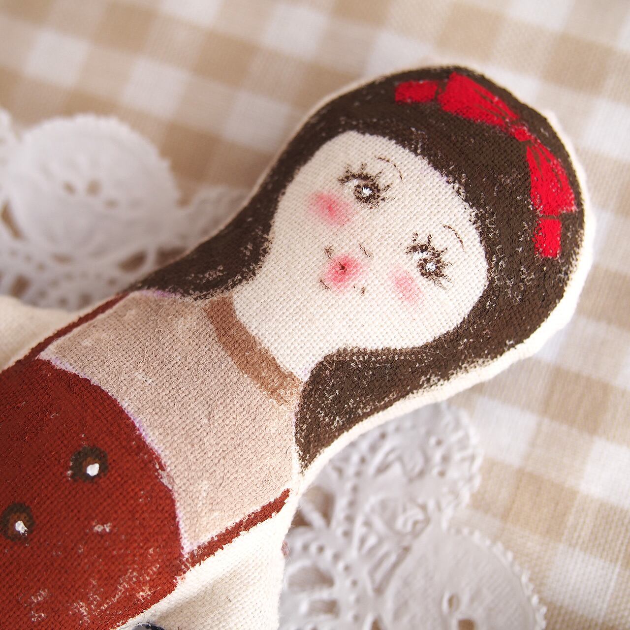 白、またはキナリの布を手縫いし、綿を入れて人形の形を作り、そこへ直接アクリル絵の具で着色しています。