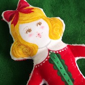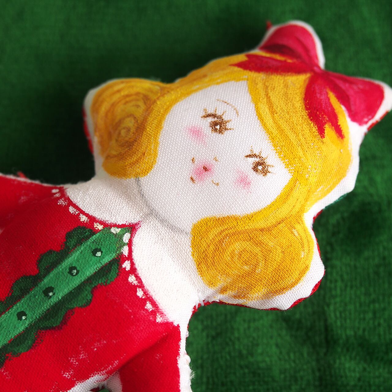 白、またはキナリの布を手縫いし、綿を入れて人形の形を作り、そこへ直接アクリル絵の具で着色しています。