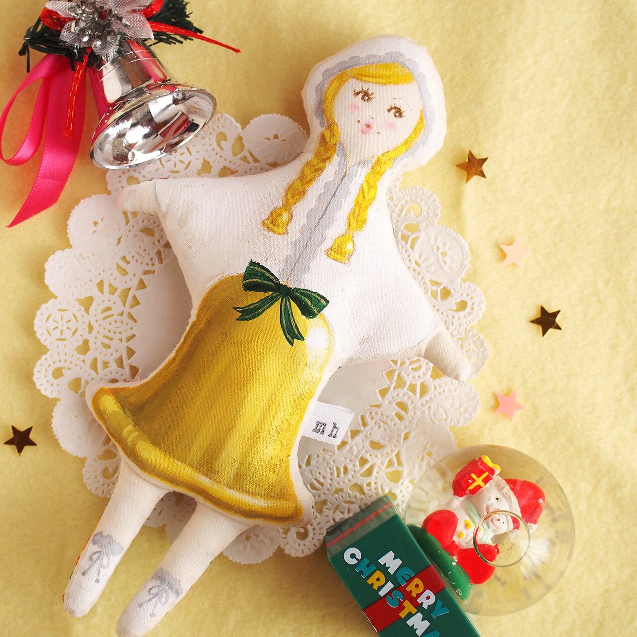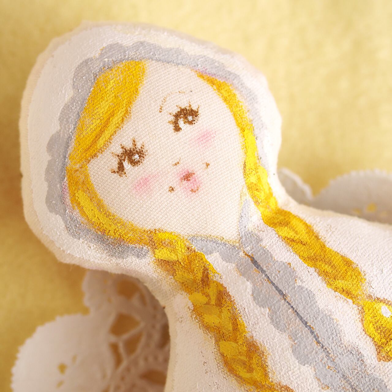 白、またはキナリの布を手縫いし、綿を入れて人形の形を作り、そこへ直接アクリル絵の具で着色しています。