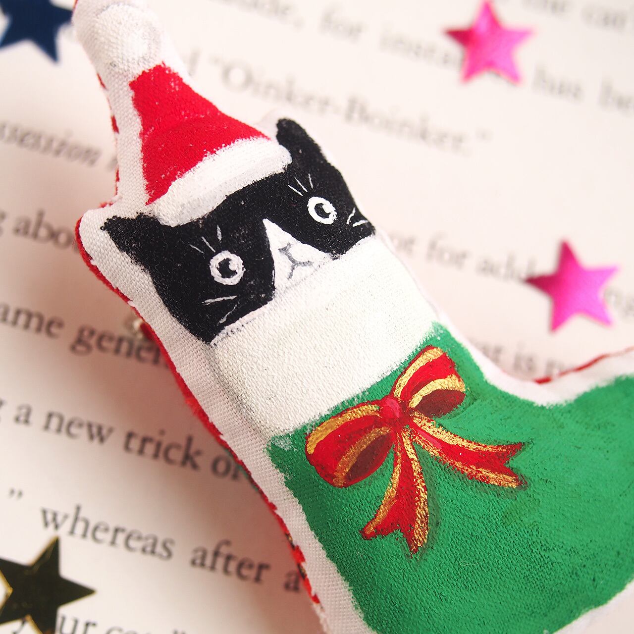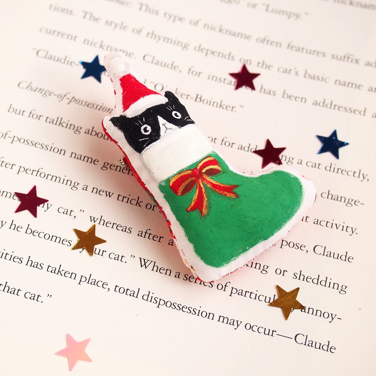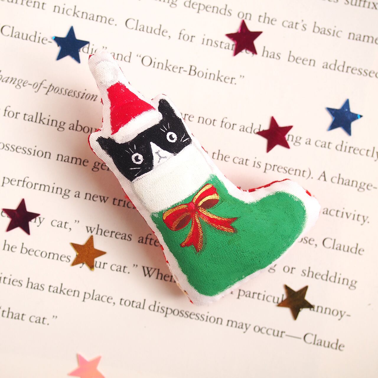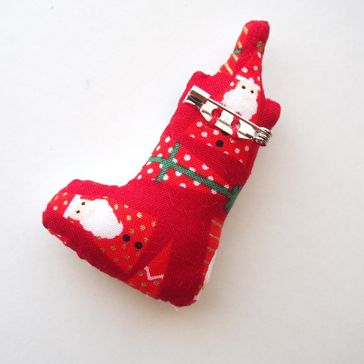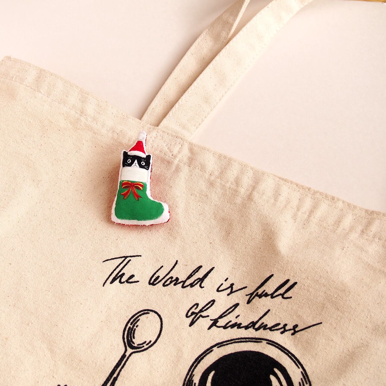 サンタブーツからこっそりのぞく、ハチワレ猫さんのブローチです。