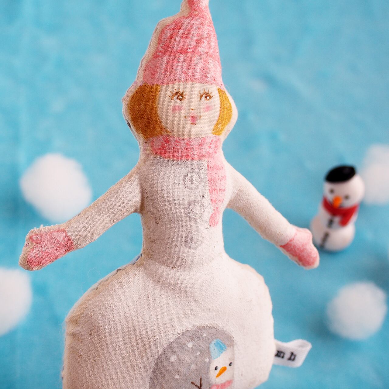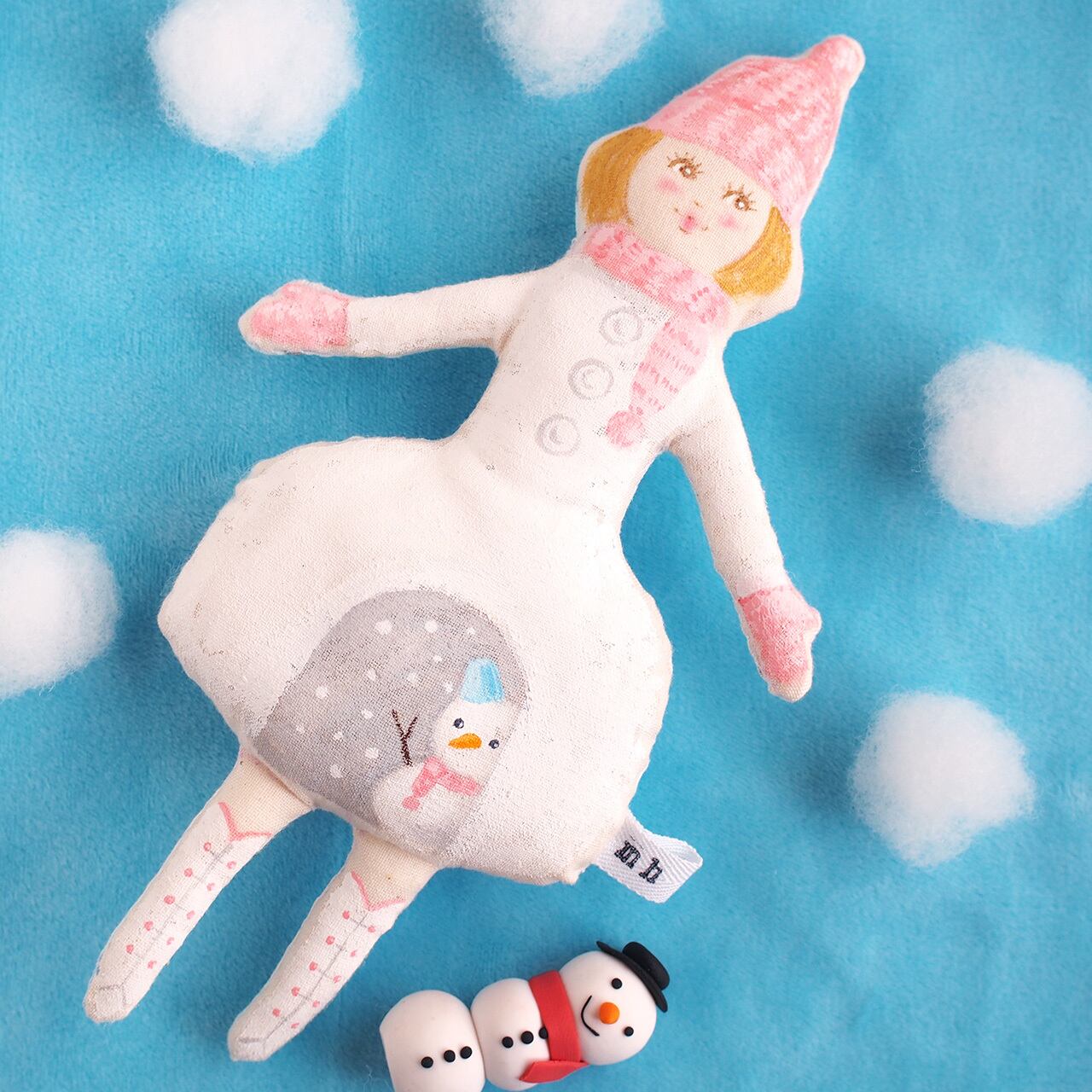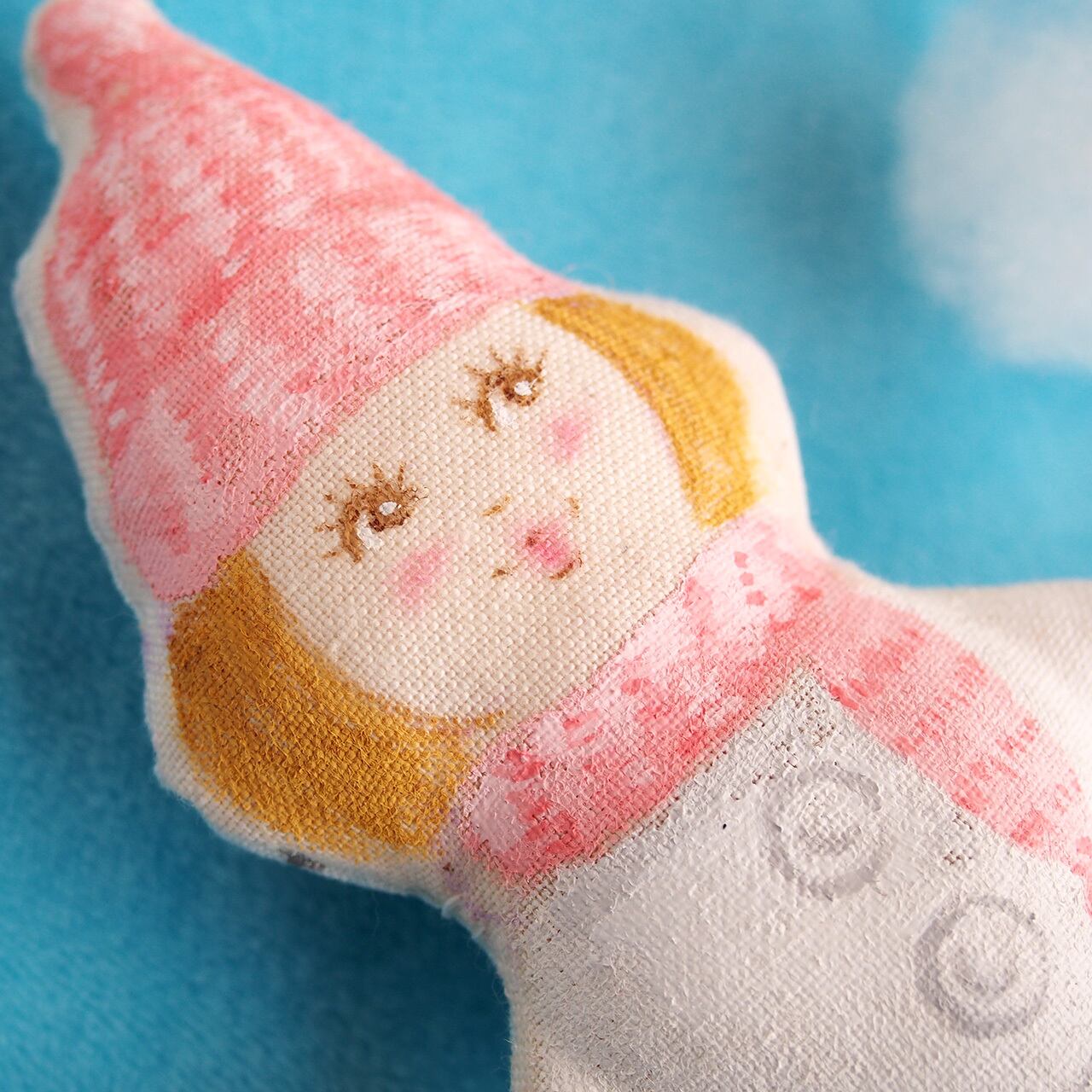 白、またはキナリの布を手縫いし、綿を入れて人形の形を作り、そこへ直接アクリル絵の具で着色しています。