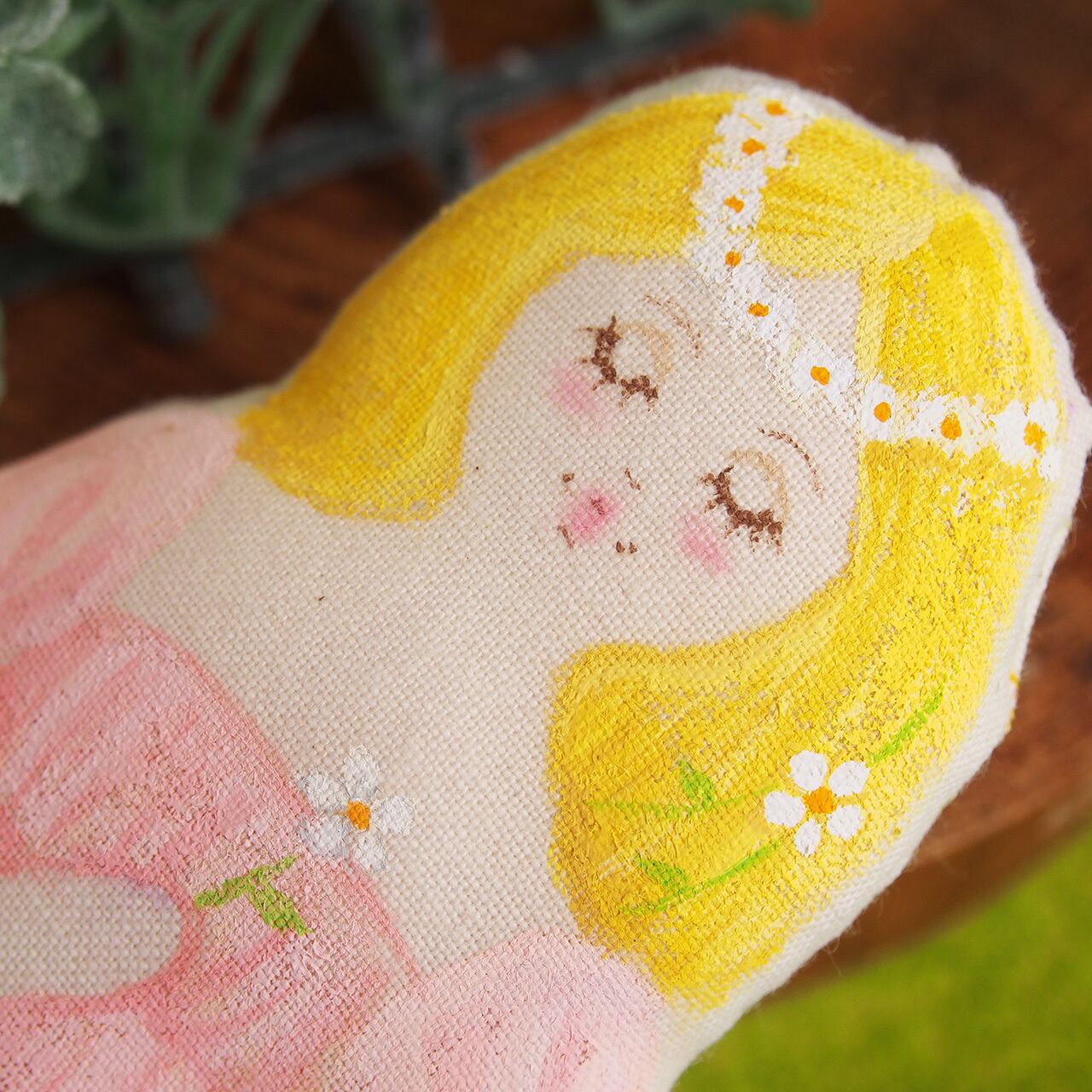 白、またはキナリの布を手縫いし、綿を入れて人形の形を作り、そこへ直接アクリル絵の具で着色しています。