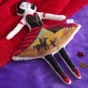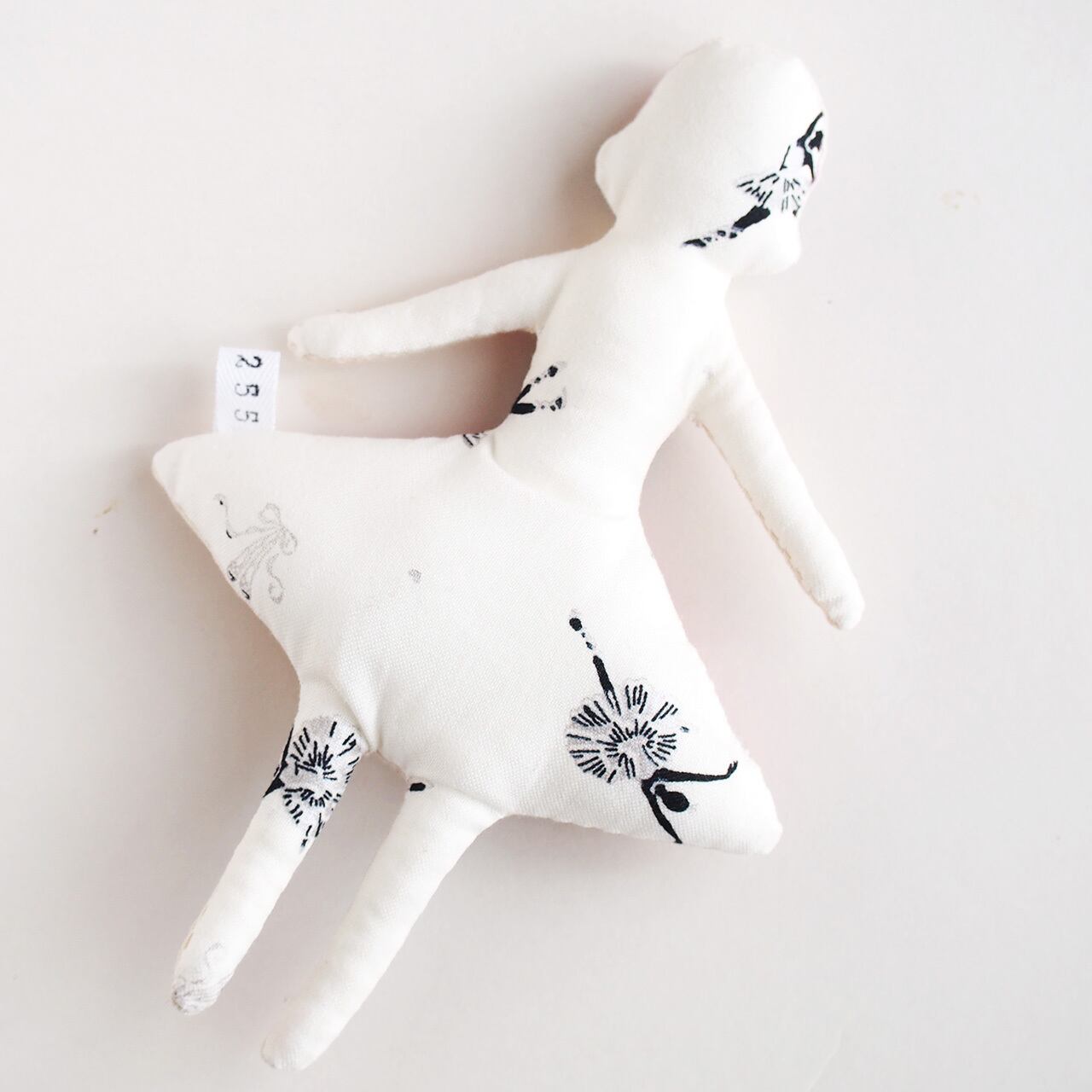 白、またはキナリの布を手縫いし、綿を入れて人形の形を作り、そこへ直接アクリル絵の具で着色しています。