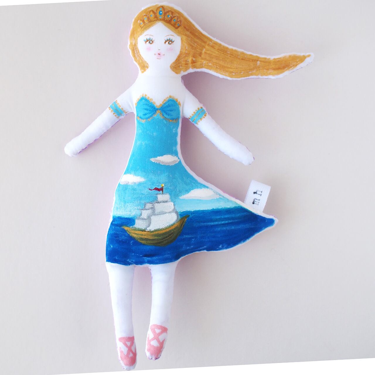 白、またはキナリの布を手縫いし、綿を入れて人形の形を作り、そこへ直接アクリル絵の具で着色しています。