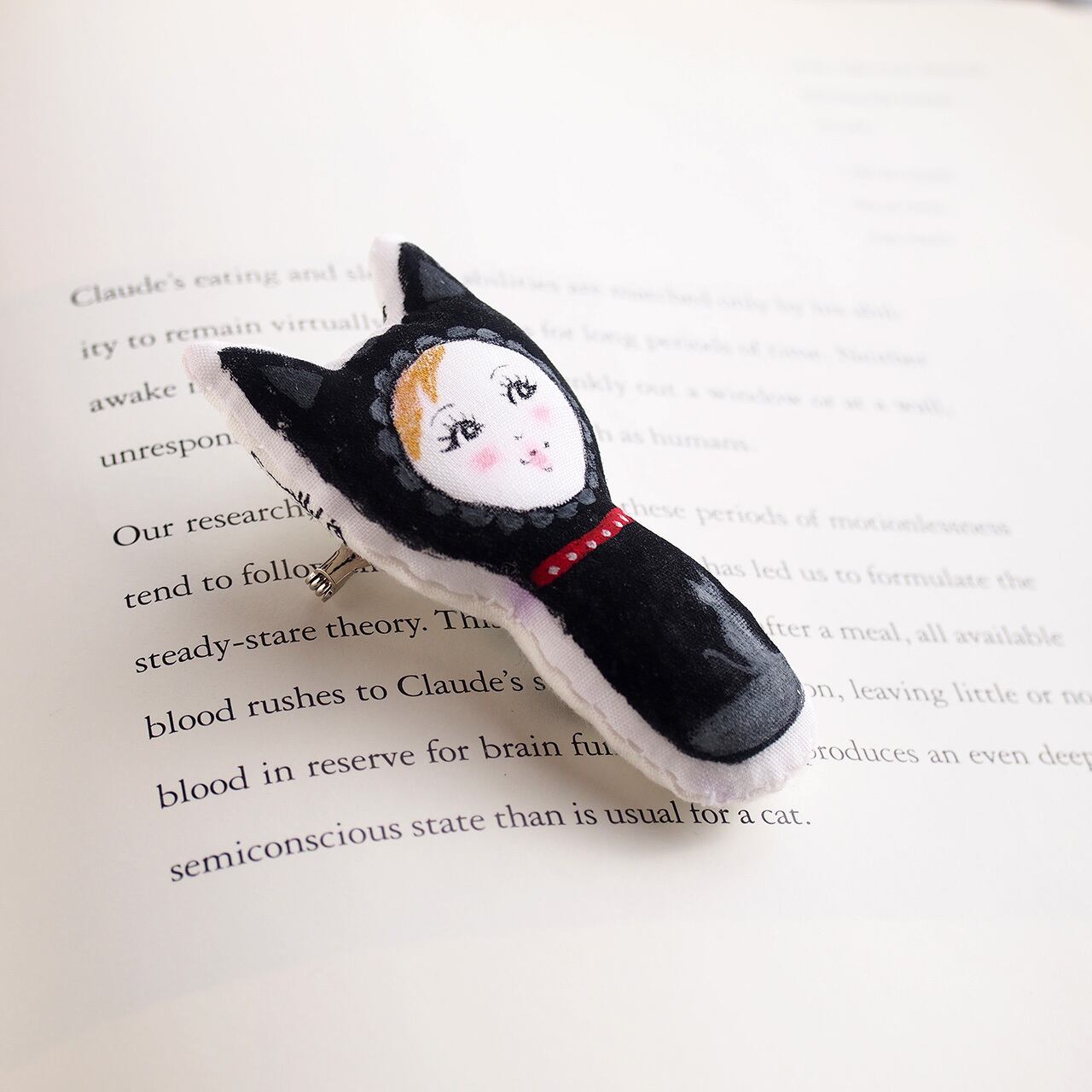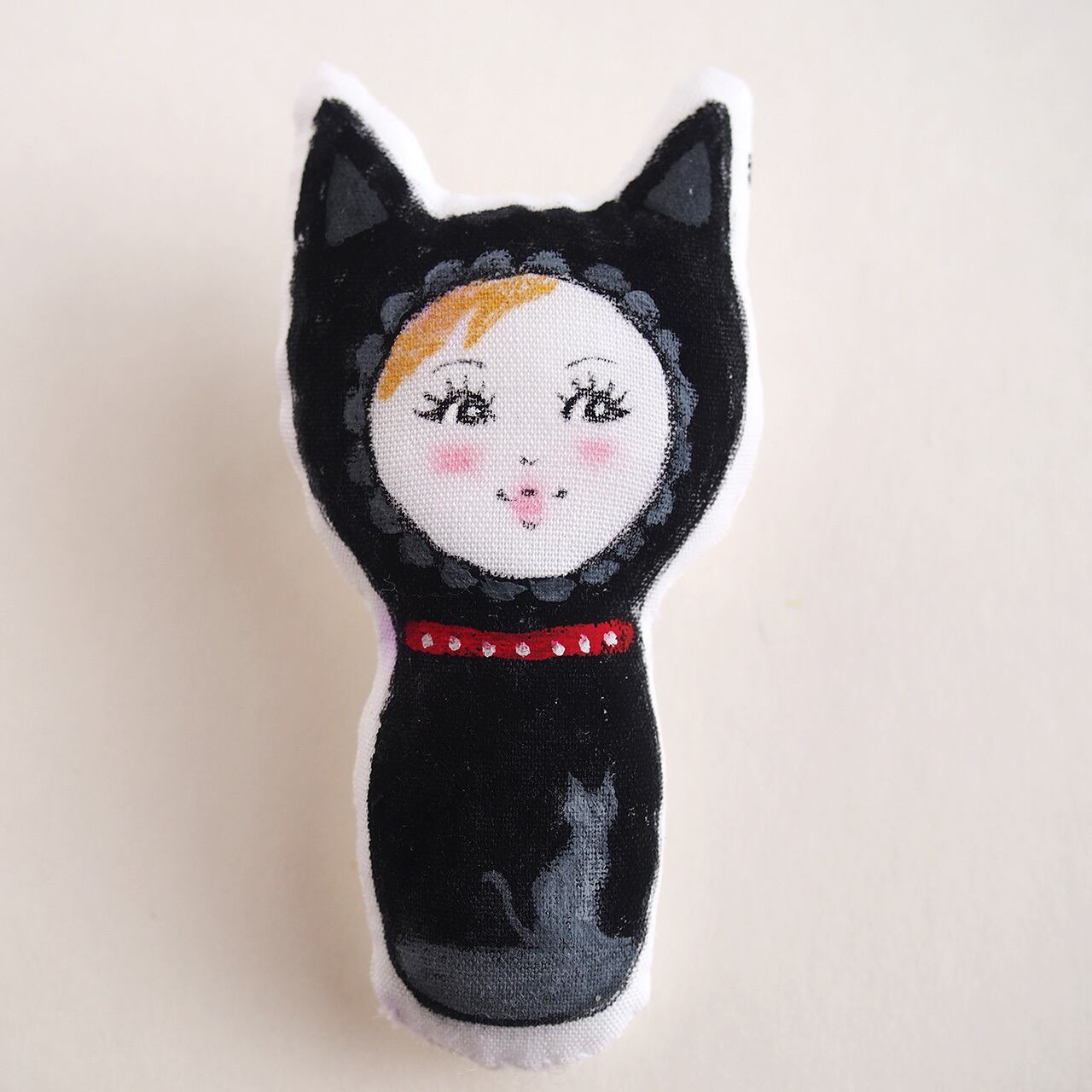赤い首輪をした、黒猫の女の子のブローチです。