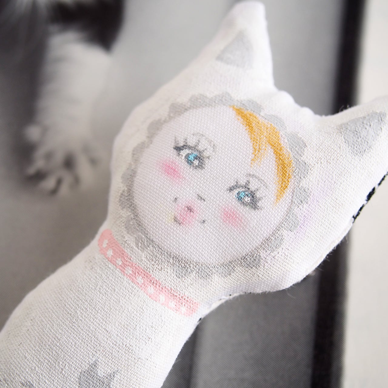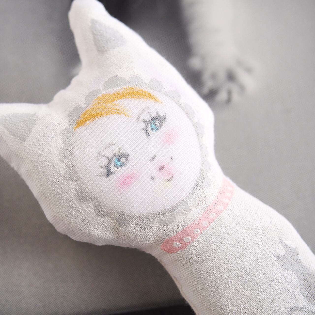 ピンクの首輪をした、白猫の女の子のブローチです。